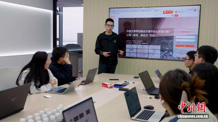 王君与团队成员在交流业务。钟欣摄