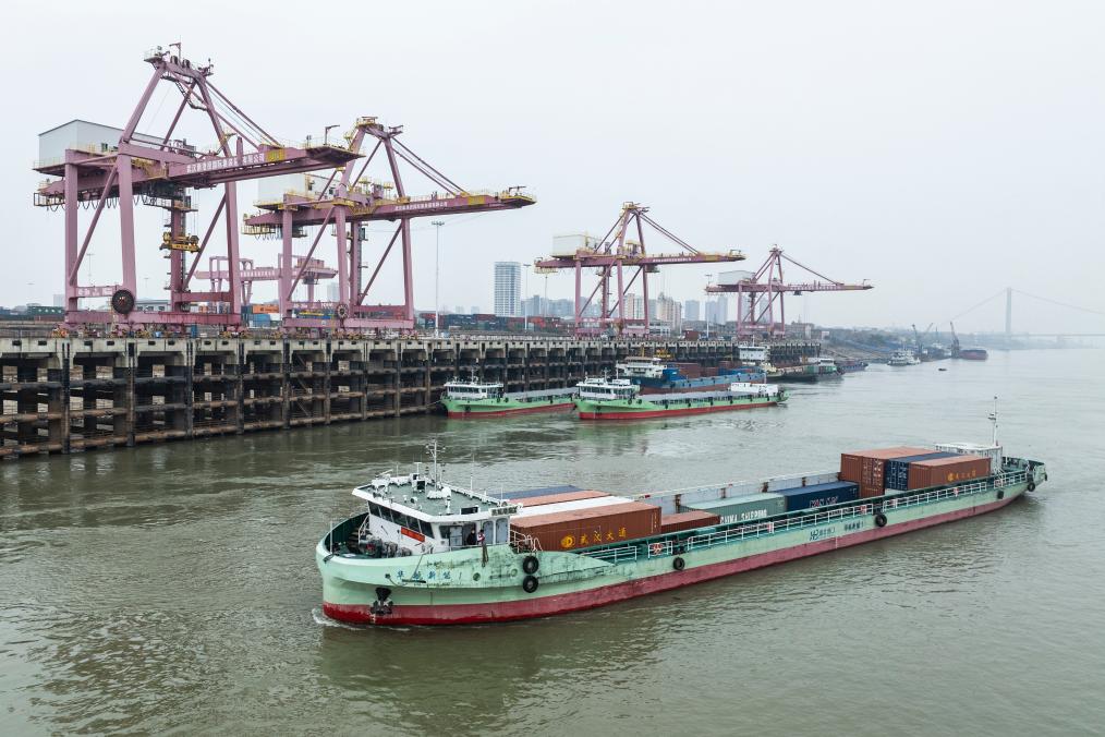 “华航新能1”轮在武汉阳逻港水域靠近停泊(无人机照片)。新华社记者伍志尊摄