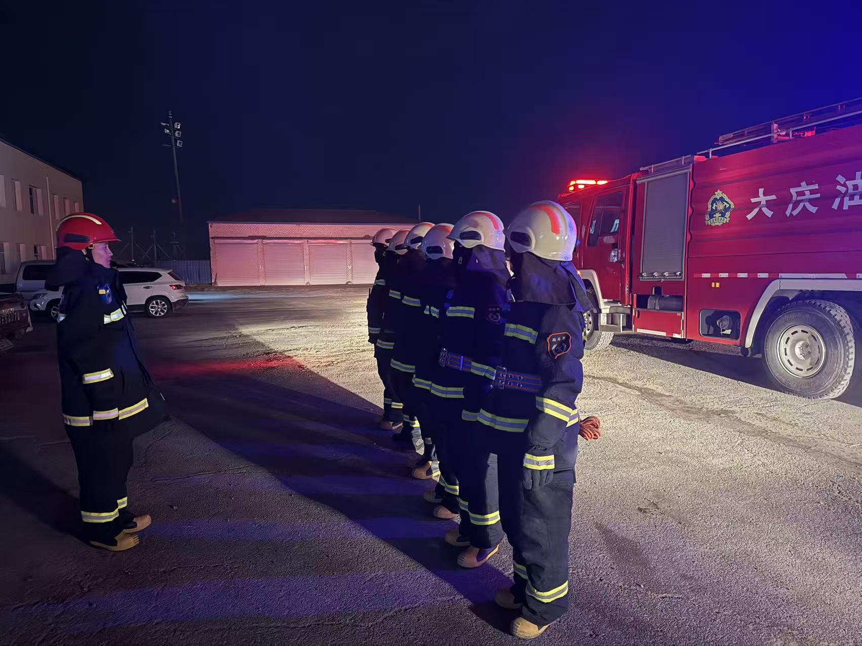 寒夜凝霜,旷野风疾。1月29日21时,大庆古龙页岩油产区气温骤降至-26℃,夜色中突发“火情”——储油撬全液面燃起熊熊烈火,浓烟裹挟着刺鼻气味在极寒空气中弥漫。支队战训部和页岩油消防大队联动,页岩油消防大队接到“报警”后,未受任何提前通知、无既定预案指引,11名指战员迅速集结,两台主战消防车呼啸出征,一场聚焦极寒环境装备性能、多灭火剂实战效能与队伍协同作战能力的冬季真火演练骤然打响。
