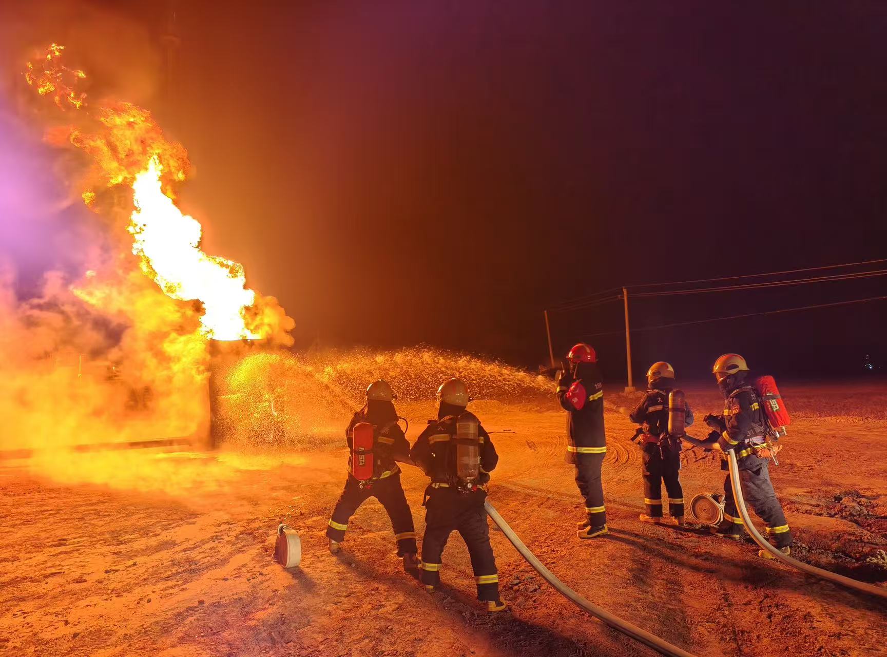 此次演练精准锚定页岩油产区冬季灭火救援痛点,以“夜间实战、真火模拟、无预案拉动”为核心,复刻储油撬全液面火灾场景,重点检验装备在极寒环境下的启动性能、续航能力及抗冻可靠性。抵达现场后,指挥员凭借页岩油火灾处置实战经验,快速完成火情研判,按照“两车一套”战斗编程,果断下达作战指令:一号车占据上风侧设置主进攻阵地,利用泡沫灭火器具准备喷射抗溶性泡沫。二号车负责侧翼掩护,同步启动干粉枪与高压水枪,形成“泡沫覆盖、冷水冷却”的立体作战体系。