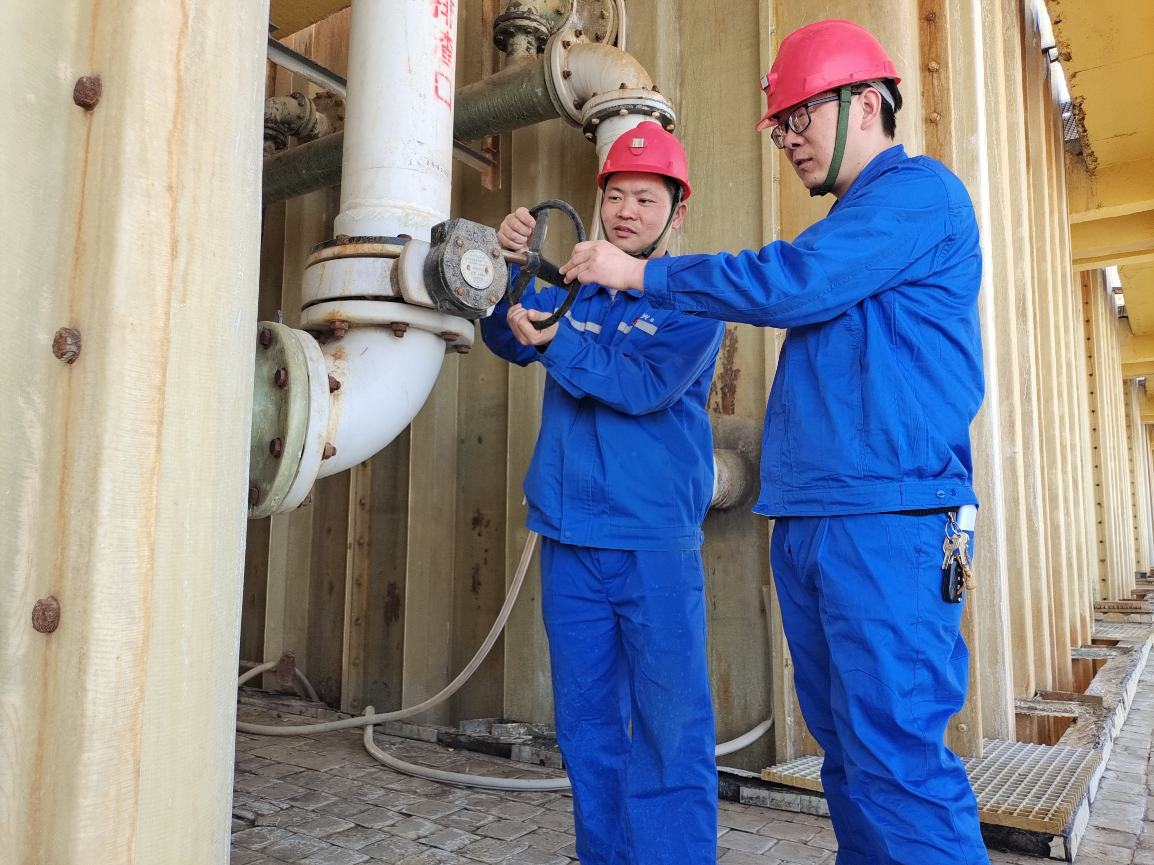 “冬季保生产,夏季防高温,车间的生产温度把控始终是关键。”秦鹏飞指着改造后的冷却塔向笔者介绍道,他和团队另辟蹊径,从出液管道改造入手,将塔顶直喷改为两侧对喷,加装蜗壳喷淋装置让液体雾化,降温幅度提升至6摄氏度~8摄氏度。7台冷却塔完成喷淋改造后,电解槽温稳定在42摄氏度~43摄氏度,高温隐患彻底消除。