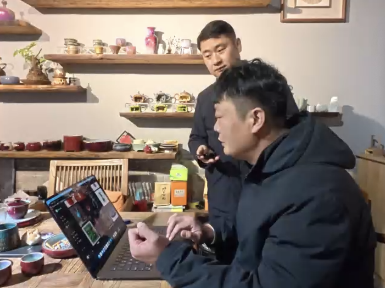 图:河南省钧陶瓷科技文创中心主任郗小冬(右)沿着长街继续深入,记者来到郗小冬的工作室。这位河南省钧陶瓷科技文创中心主任,正对着电脑屏幕操作他自研的AI平台“钧匠人”。屏幕上,一张概念图几秒钟内便生成了3D模型,釉色在模型上逼真呈现。“我们收集了千余种钧瓷釉色的实拍数据,可以精准预判成品视觉效果,大幅降低试错成本。”郗小冬介绍,平台已服务本地十余家窑口,免费提供AI工具赋能。