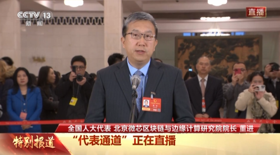 今天(3月5日),十四届全国人大四次会议首场“代表通道”在人民大会堂举行,全国人大代表、北京微芯区块链与边缘计算研究院院长董进接受记者采访。
