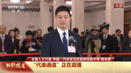今天(3月5日),十四届全国人大四次会议首场“代表通道”在人民大会堂举行,全国人大代表、中国一汽研发总院首席技能大师杨永修接受中央广播电视总台记者采访。