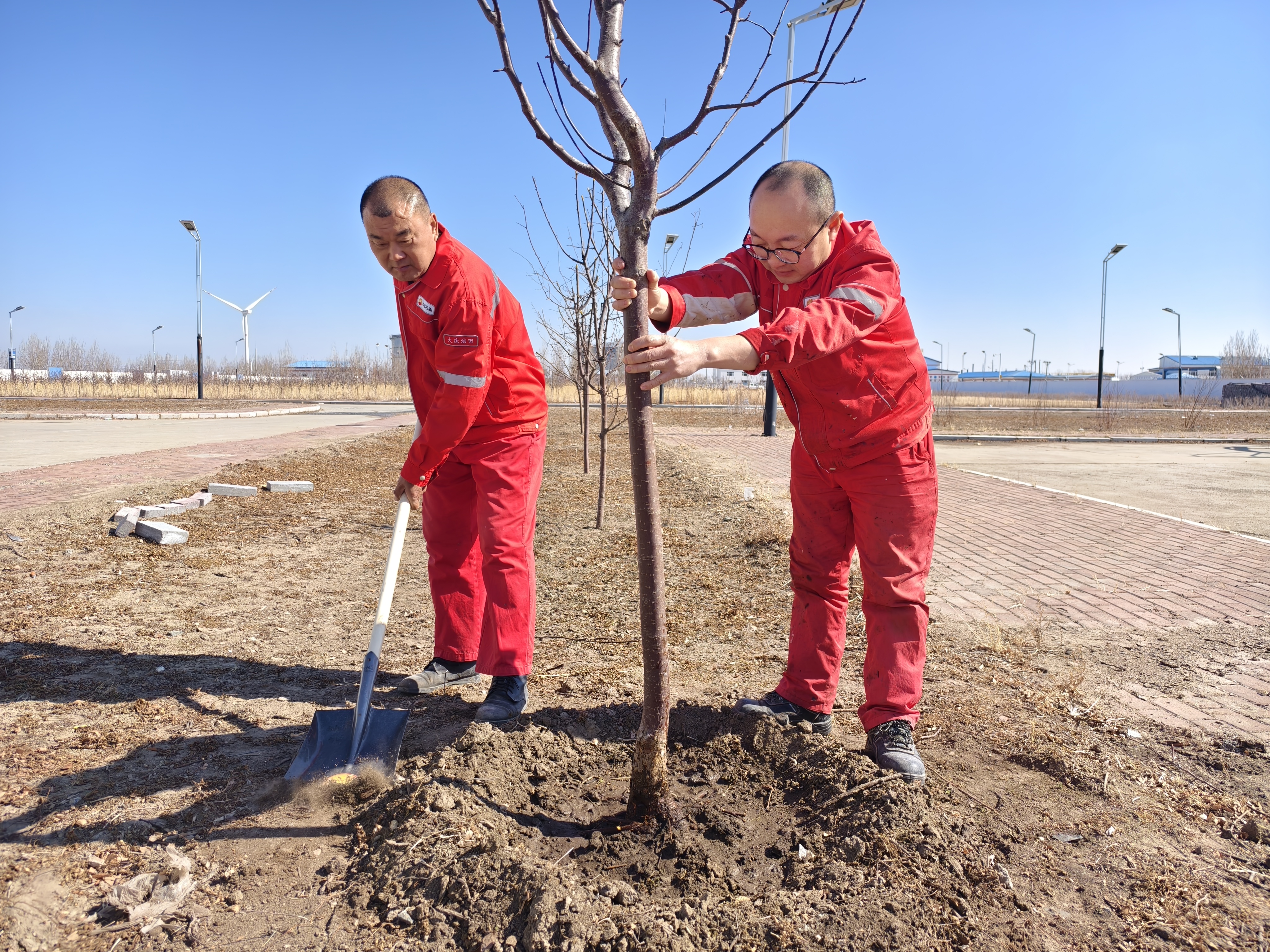 细化流程标准,扎实推进植绿实践。在集输站区花园的植树现场,一场分工明确、协作高效的植绿行动有序展开。员工们自发组成整地、栽苗、养护等专项小组,形成“分组作业、全程闭环”的工作模式:先由经验丰富的老员工带队进行整地挖坑,严格按照苗木生长需求控制坑的深度与间距;栽苗环节,大家小心翼翼扶直苗木,确保根系舒展,再分层培土压实,避免苗木倒伏;后续养护小组及时跟进,精准把控浇水量,同时做好苗木标识,为后续管护奠定基础。从前期土壤改良到后期苗木养护,每一个环节都建立了细致的操作规范,员工们全程严格执行,用严谨态度确保每一株苗木都能扎根存活。