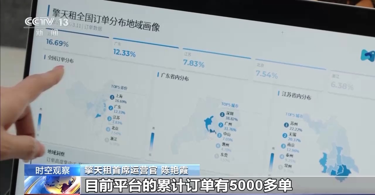 擎天租首席运营官陈艳霞:订单大屏上能看到,我们的业务正在上海、广东、江苏、北京、浙江都在全面运转。目前平台的累计订单有5000多单。现在我们的整体的订单已经排到了五一(劳动)节以后。