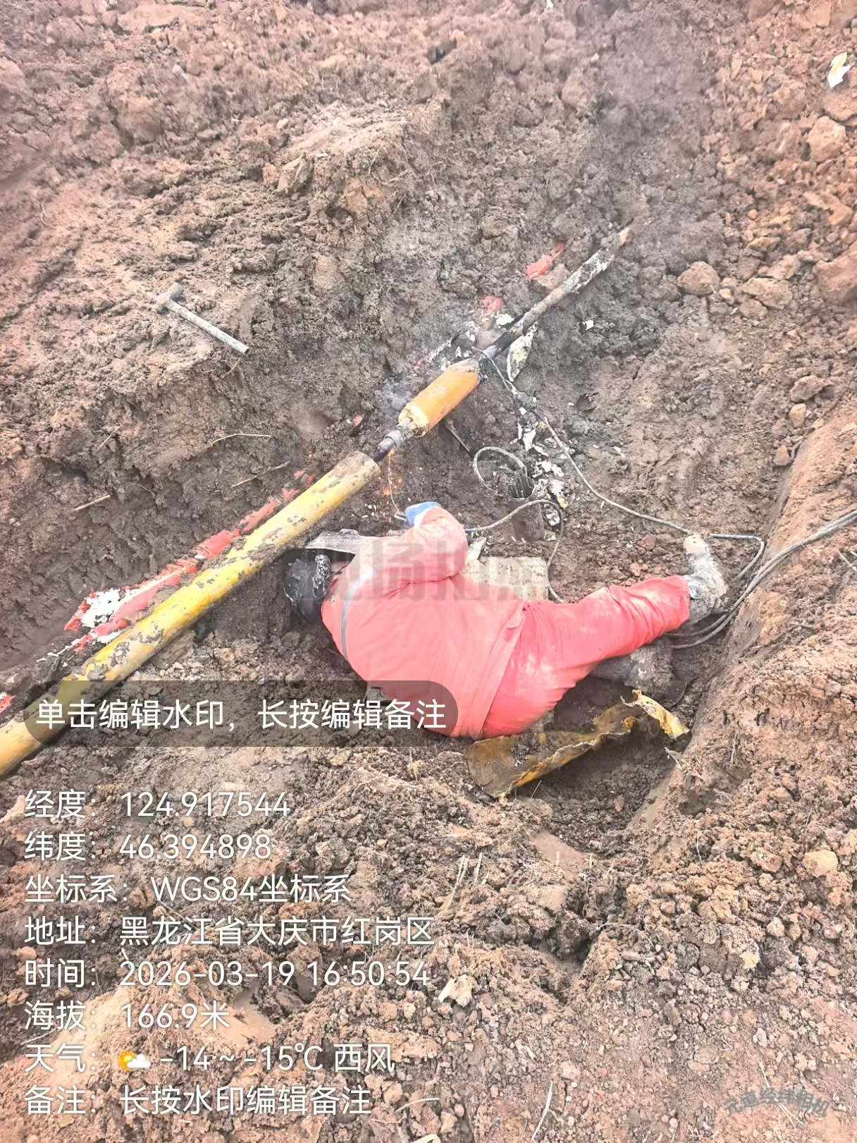 一个半小时过去了,正当大家累得气喘吁吁地时刻,一股细流从漏点处直射而来,直接打在抢修人员的身上。“快看,漏点找到了!”采油工张立伟不禁激动地喊出了声。现场指挥的张班长急忙放下铁锹,查看漏点,电焊工王师傅立刻拿起焊枪在冰冷的泥坑中对准漏点进行焊接封堵。