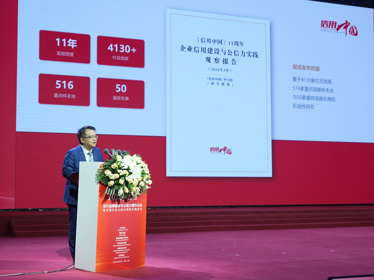 3月22日,2026当代品牌建设与公信力提升论坛在北京隆重举办。本次论坛是《信用中国》栏目开播11周年重要主题活动,也是在“当代品牌建设与公信力提升座谈会”基础上升级打造的年度行业盛会,政产学研媒企各界代表齐聚,围绕品牌建设、信用治理、传播赋能等核心议题研讨交流,为中国企业增强品牌影响力、提升公信力凝聚共识,赋能高质量发展。