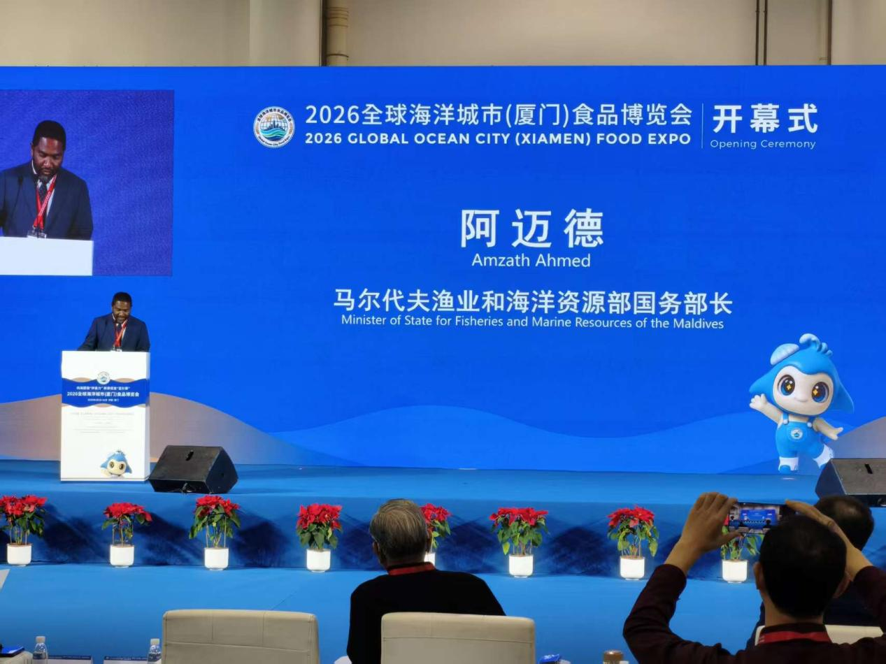马尔代夫渔业和海洋资源部国务部长阿迈德代表国际嘉宾致辞,表达了深化海洋产业国际合作、共促蓝色经济繁荣发展的美好愿景,传递出跨越山海、携手共赢的真诚期盼。