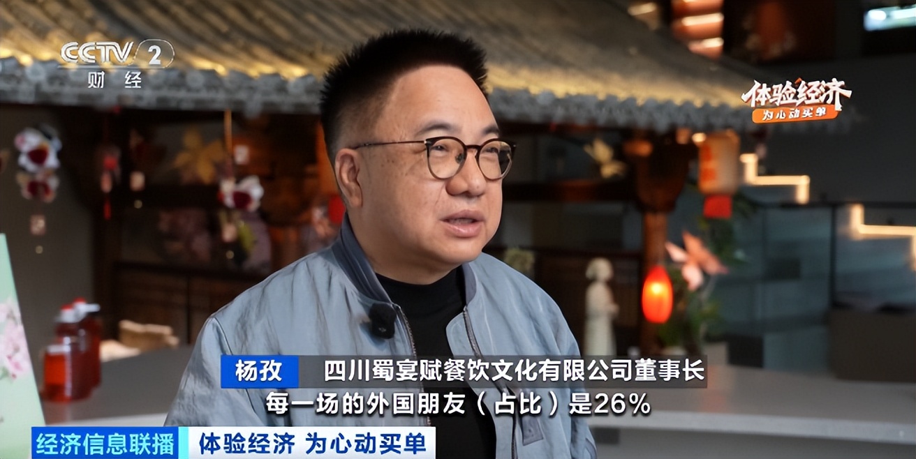 四川蜀宴赋餐饮文化有限公司董事长 杨孜:去年平均接待的每一场的外国朋友占比是26%,提供的是文化和情绪价值。