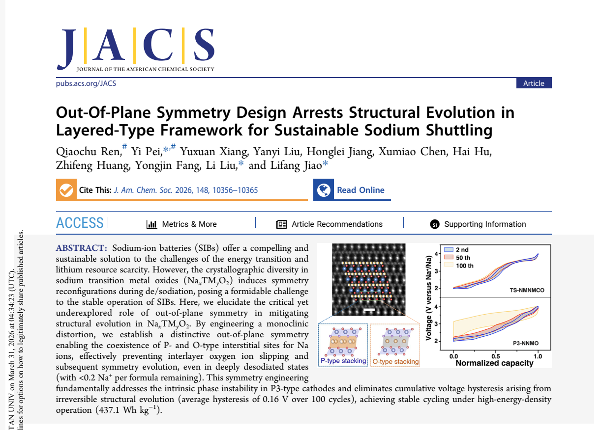 3月31日,记者从湘潭大学获悉,该校化学学院刘黎教授团队,联合南京航空航天大学和南开大学科研团队,从晶体学对称性出发,提出了一种极具突破性的“面外对称性设计”结构,为高性能钠离子电池正极材料的设计提供了新范式。相关成果日前发表于国际顶级期刊《美国化学会志》上。成果为钠离子电池由实验室研究迈向实际应用与产业化发展提供了重要的技术参考。