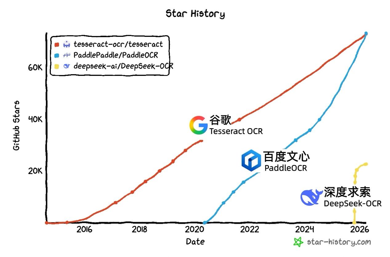 在这一背景下,2025年以来,各家人工智能厂商均在OCR领域加大布局投入。此前的1月底,DeepSeek更新发布了DeepSeek-OCR2模型,可根据图像含义动态重排图像各部分,模拟了人类观看场景的逻辑流程,使得其在处理复杂图片时更智能、更有逻辑,并且在保持极高精度的同时,严格控制了计算成本。此外,智谱、腾讯混元等也都推出了各自的OCR模型。PaddleOCR在GitHub上的星标数也自2024年起开始爆发式增长。