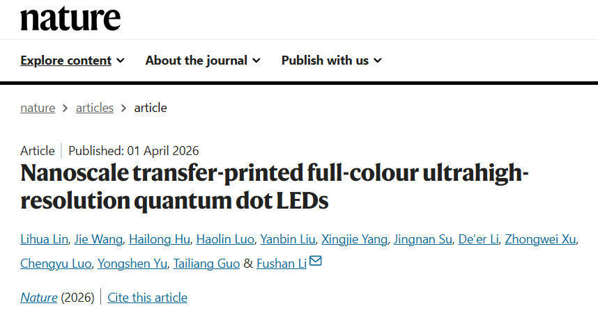 据介绍,这是福州大学信息类学科首次以第一单位在《自然》发表研究成果。论文题为《纳米转印实现全彩超高分辨量子点发光二极管》,第一作者为福州大学青年教师林立华,通讯作者为李福山教授,福州大学为第一完成单位,闽都创新实验室为合作完成单位。