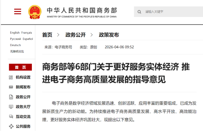 发布主体:商务部、中央网信办、工信部、农业农村部、文旅部、市场监管总局联合发布《关于更好服务实体经济推进电子商务高质量发展的指导意见》。