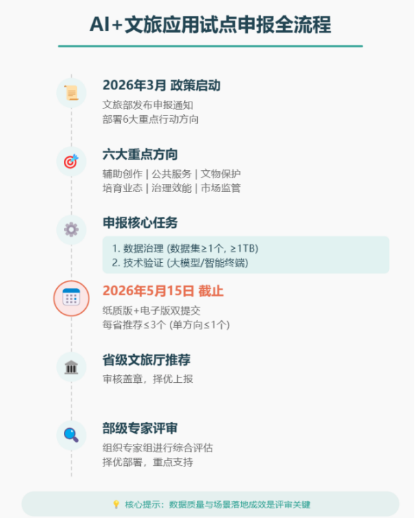 政策背景:文旅部办公厅于3月25日印发《办科教函〔2026〕143号》文件,旨在推动人工智能在文旅行业的深度应用。各省(福建、安徽等)于3月30日启动推荐工作。