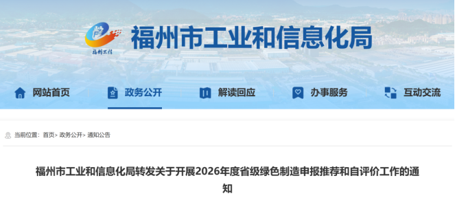 发布主体:福建省工业和信息化厅发布《关于开展2026年度省级绿色制造申报推荐和自评价工作的通知》。