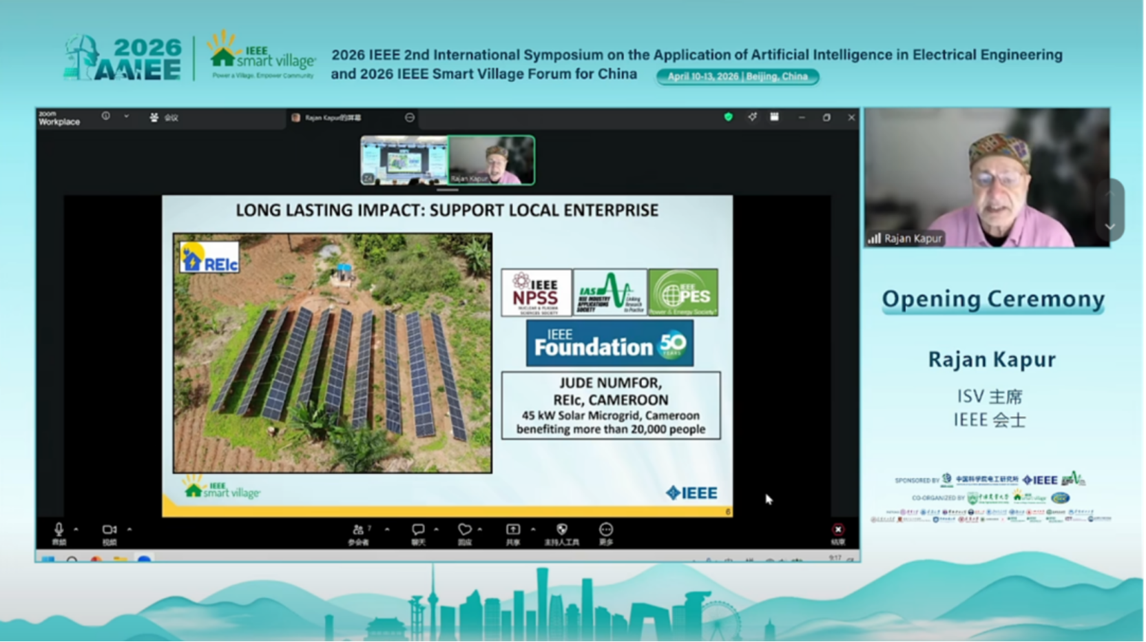 IEEE智慧乡村主席RajanKapur以智能村项目为主题做主旨演讲。他表示,该项目自创立以来,通过提供可再生能源系统与技术培训,帮助社区建立自营企业,实现20至30年长期运营。项目从南亚、非洲扩展至中国、拉美等地,依托本地领导力与社区参与,在尼日利亚、印度、阿根廷及中国等地取得显著成效,惠及超200万人。未来目标是服务全球8亿无电人口,推动实现“太阳能独立”。