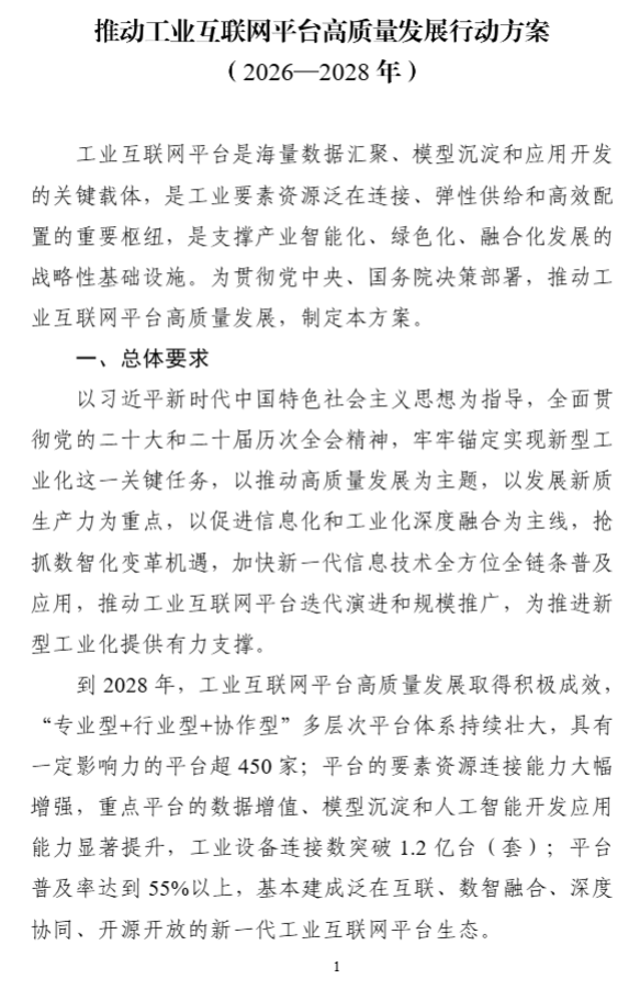 为深入贯彻党中央、国务院有关决策部署,加快工业互联网创新发展,工业和信息化部组织编制了《推动工业互联网平台高质量发展行动方案(2026—2028年)》。现印发给你们,请结合实际抓好落实。
