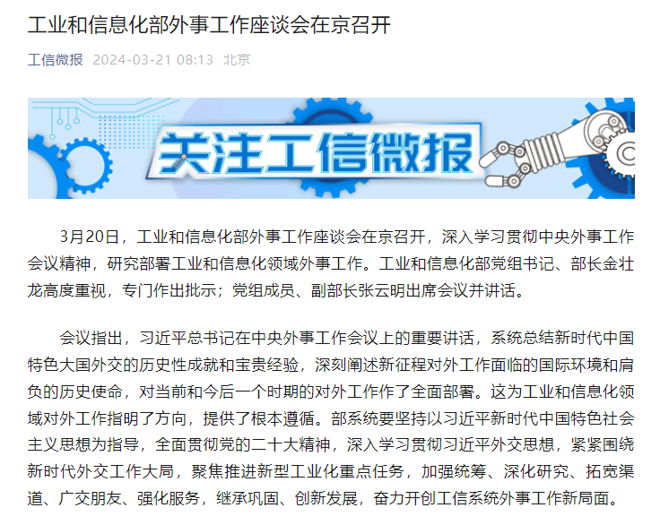 据“工信微报”微信公众号消息,3月20日,工业和信息化部外事工作座谈会在京召开,深入学习贯彻中央外事工作会议精神,研究部署工业和信息化领域外事工作。