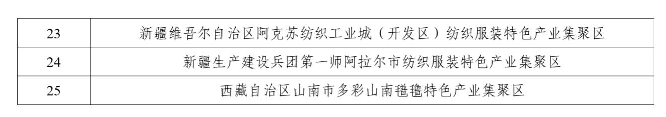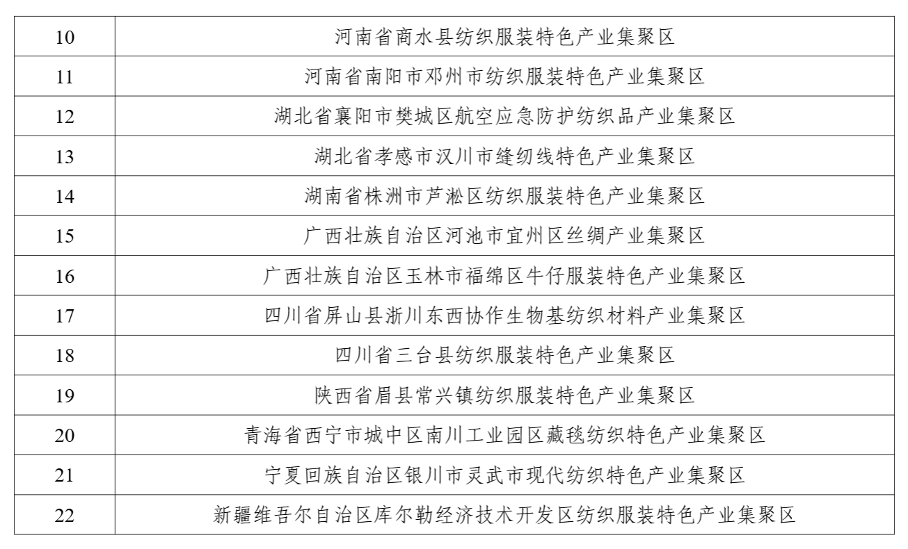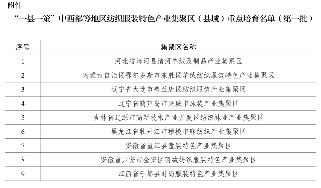 工业和信息化部关于公布《“一县一策”中西部等地区纺织服装特色产业集聚区(县域)重点培育名单(第一批)》的通告