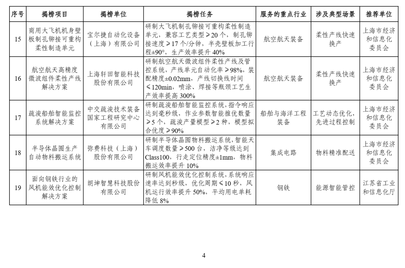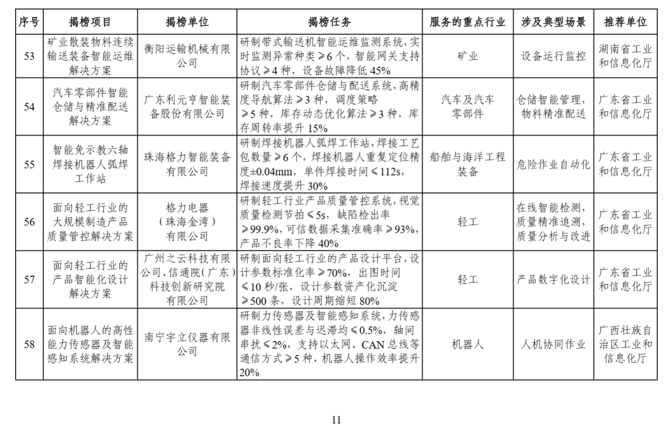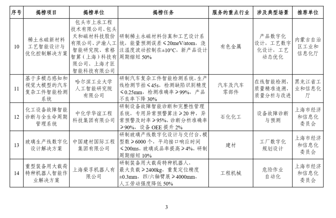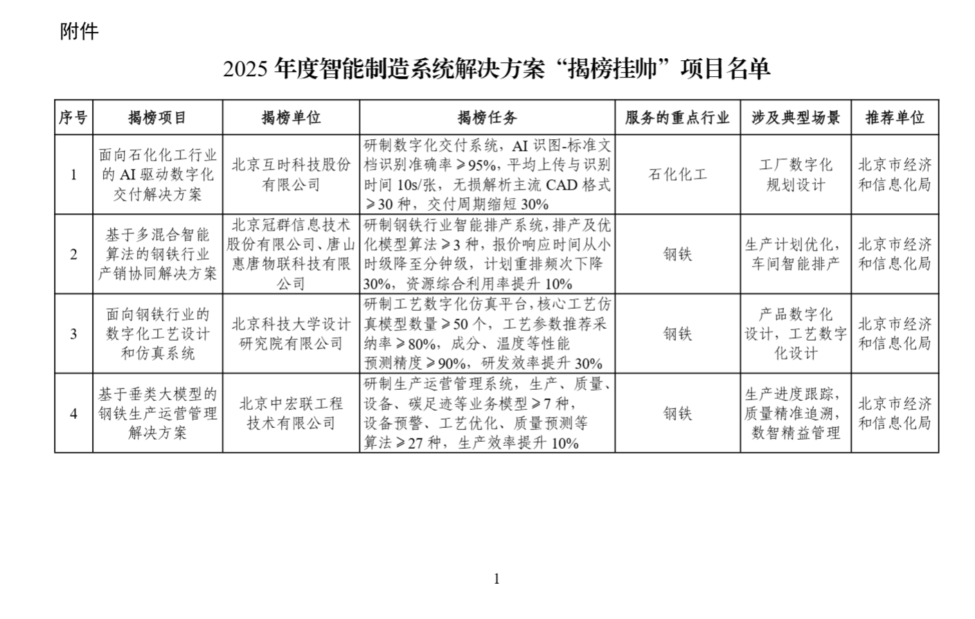 为贯彻落实《制造业数字化转型行动方案》,按照《“十四五”智能制造发展规划》任务部署,打造智能制造“升级版”,经省级有关部门推荐、专家评审、网上公示等程序,现将2025年度智能制造系统解决方案“揭榜挂帅”项目名单印发给你们,请加强指导、监督和服务,鼓励给予相应政策支持。
