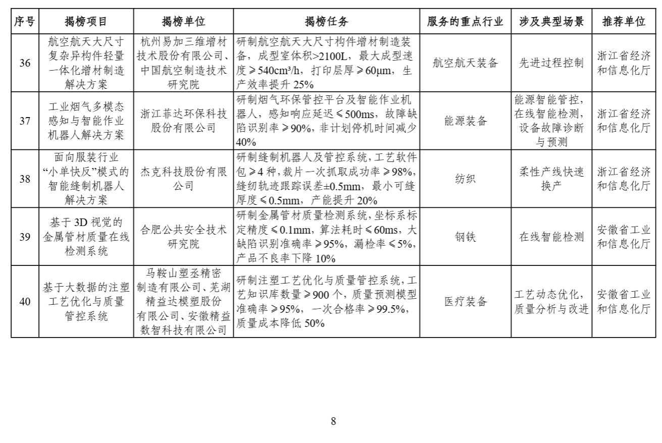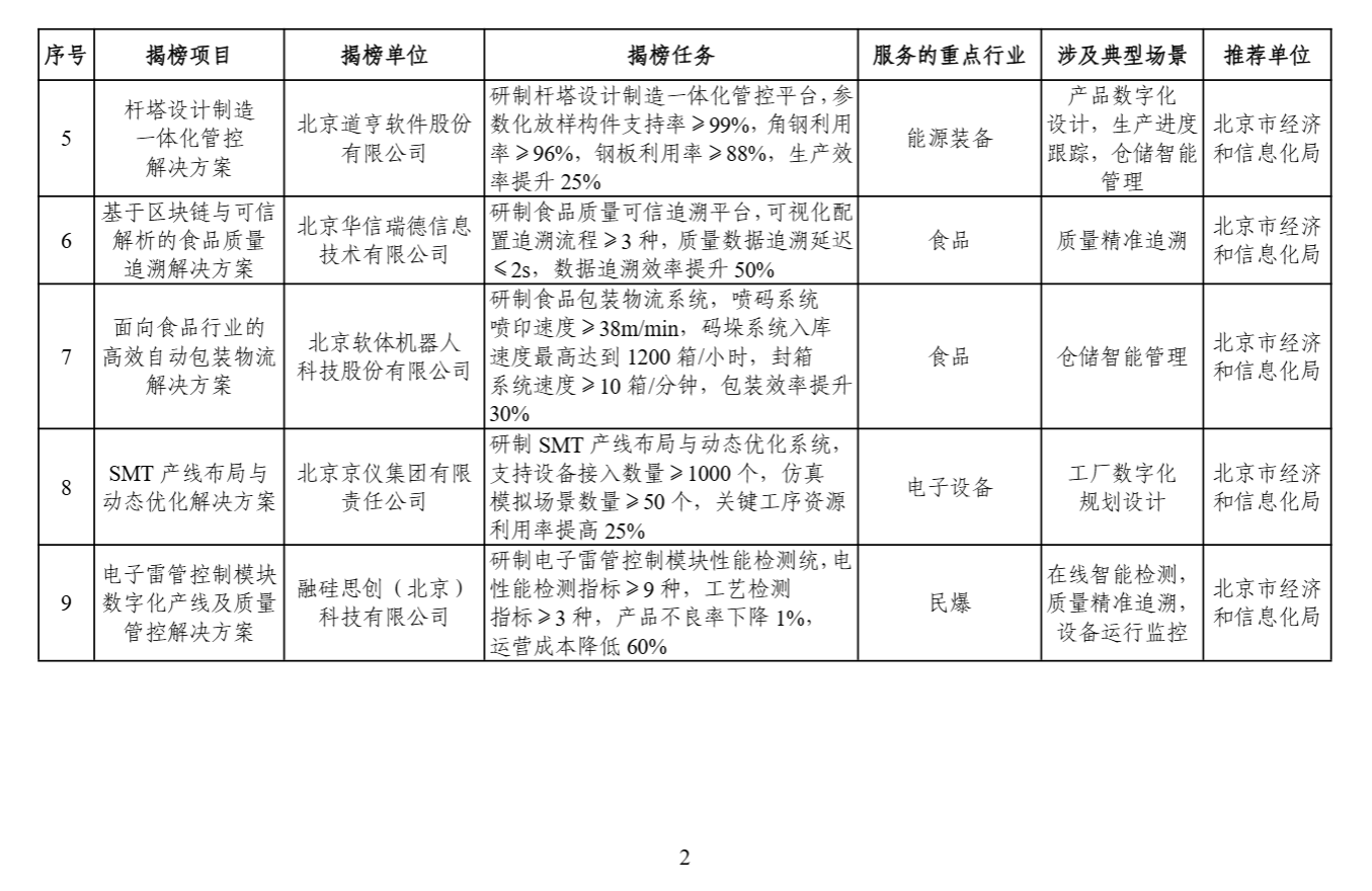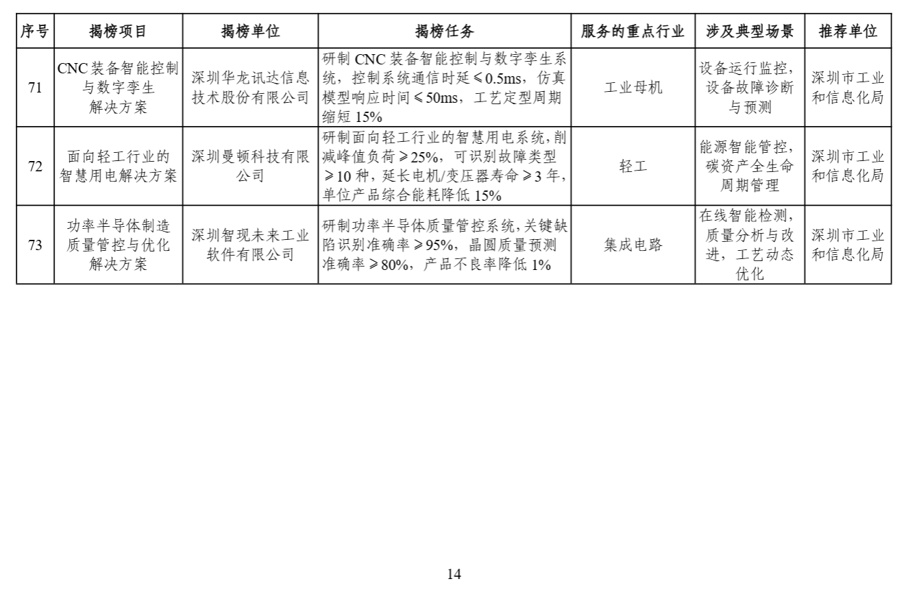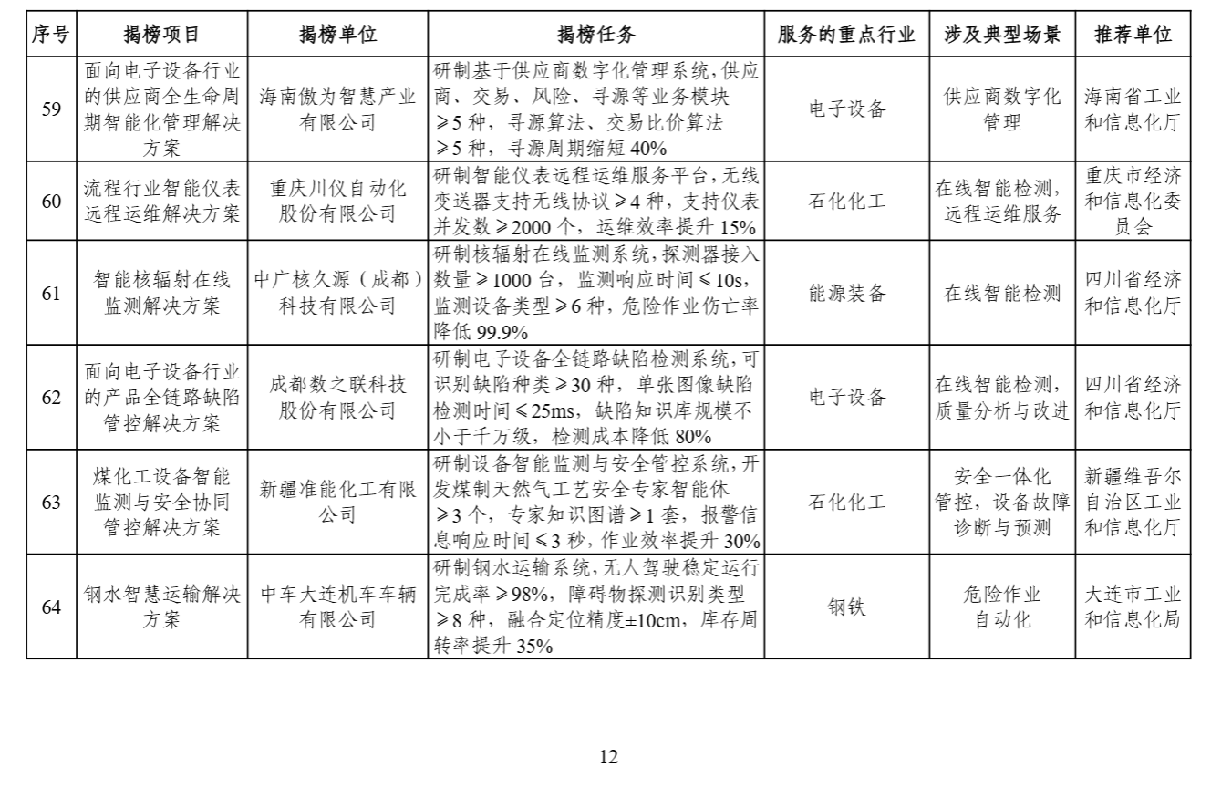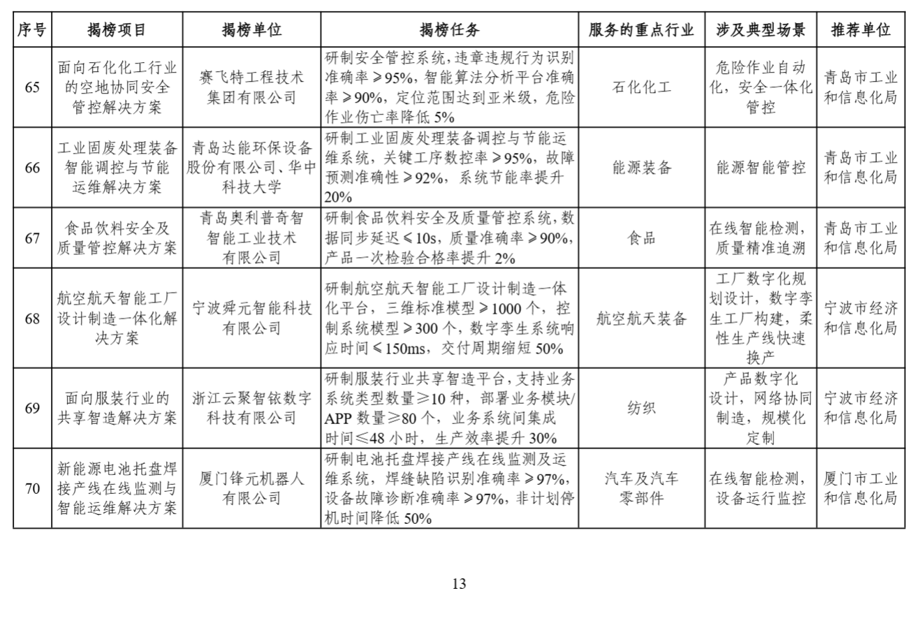 为贯彻落实《制造业数字化转型行动方案》,按照《“十四五”智能制造发展规划》任务部署,打造智能制造“升级版”,经省级有关部门推荐、专家评审、网上公示等程序,现将2025年度智能制造系统解决方案“揭榜挂帅”项目名单印发给你们,请加强指导、监督和服务,鼓励给予相应政策支持。