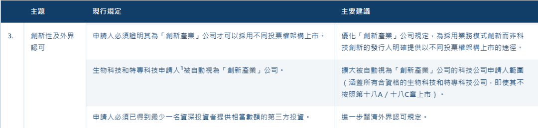 对于不同投票权申请人需满足港交所“创新产业公司”的认定,港交所建议,优化“创新产业”公司规定,为采用业务模式创新而非科技创新的发行人提供以不同投票权架构上市的途径。同时,港交所建议将所有符合资格的生物科技及特专科技公司(即使不按18A或18C章节上市)自动视为“创新产业”公司。