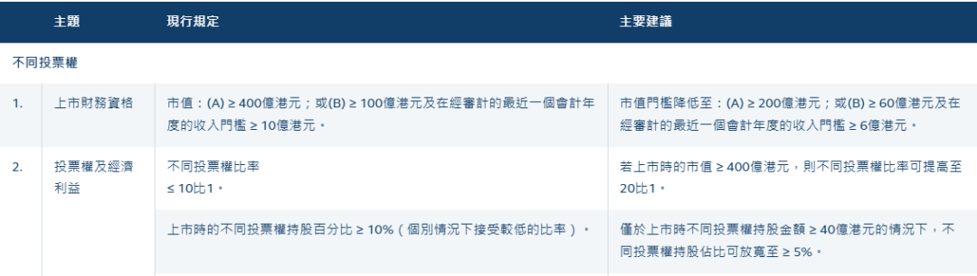 港交所建议,下调不同投票权公司上市的市值门槛,A类标准市值门槛从400亿港元降至200亿港元,B类标准市值门槛从100亿港元降至60亿港元且收入门槛从10亿港元下调至6亿港元。在下调市值门槛的同时,港交所建议,上市时市值达400亿港元的申请人,不同投票权比率可提高至20:1。