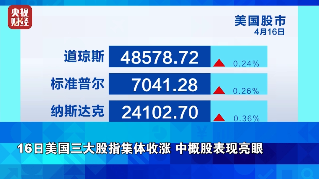 当地时间周四,美国总统特朗普宣布,以色列和黎巴嫩已达成为期10天的停火协议。而此前伊朗方面曾表示,以色列停止对黎巴嫩的军事打击,是启动伊朗问题谈判的关键条件。另一方面,美国劳工统计局周四公布的数据显示,截至4月11日一周,经季节性调整后的首次申请失业救济人数为20.7万人,较前一周减少1.1万人,低于预期值。市场对中东地缘冲突有望缓解以及美国劳动力市场持乐观态度,投资者风险偏好回升,推动美国三大股指集体收涨,纳指连续12个交易日上涨,为2009年以来最长连涨纪录,并与标普500指数一起再度创下收盘历史新高。截至收盘,道指上涨0.24%,标普500指数上涨0.26%,纳指涨幅为0.36%。