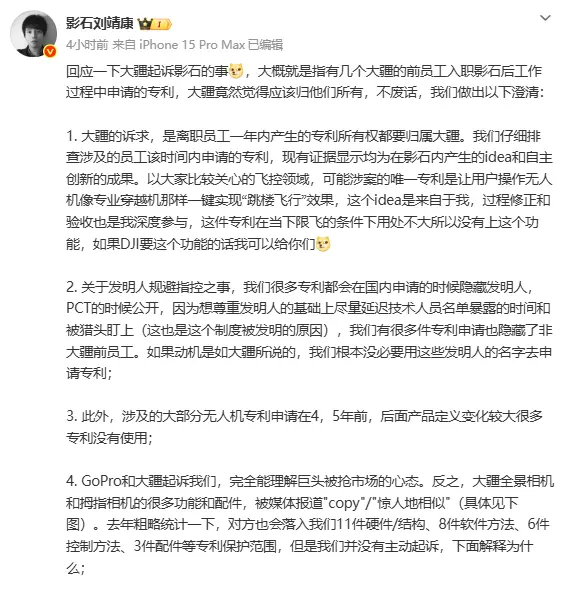 影石创新回应“被大疆起诉”:不涉核心及重大专利
