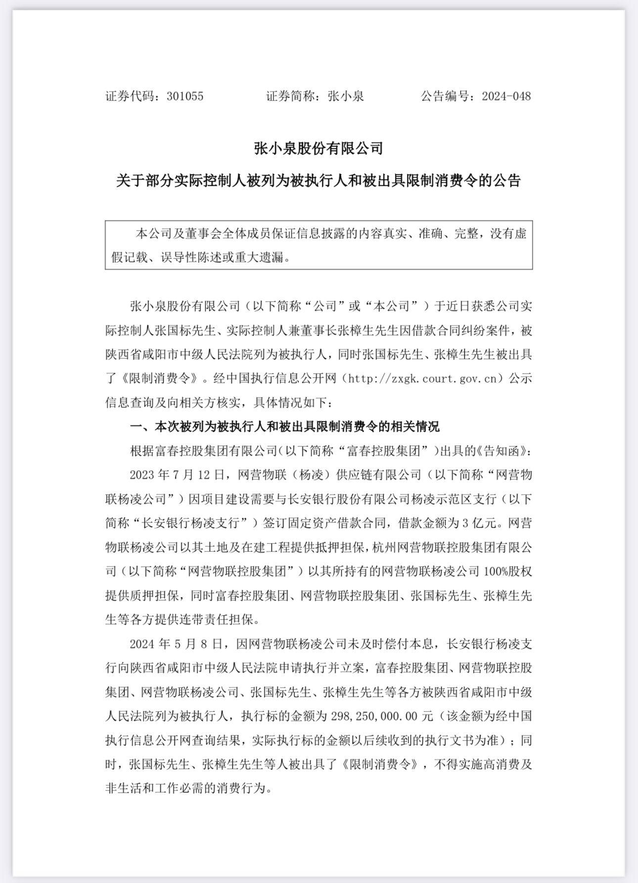 张小泉表示,公司已督促张国标、张樟生及富春控股集团积极与执行申请人沟通协调处理相关事宜,寻求最佳解决方案,争取尽快履行给付义务,化解偿债风险,如后续有进一步解决方案或其他风险,及时告知公司