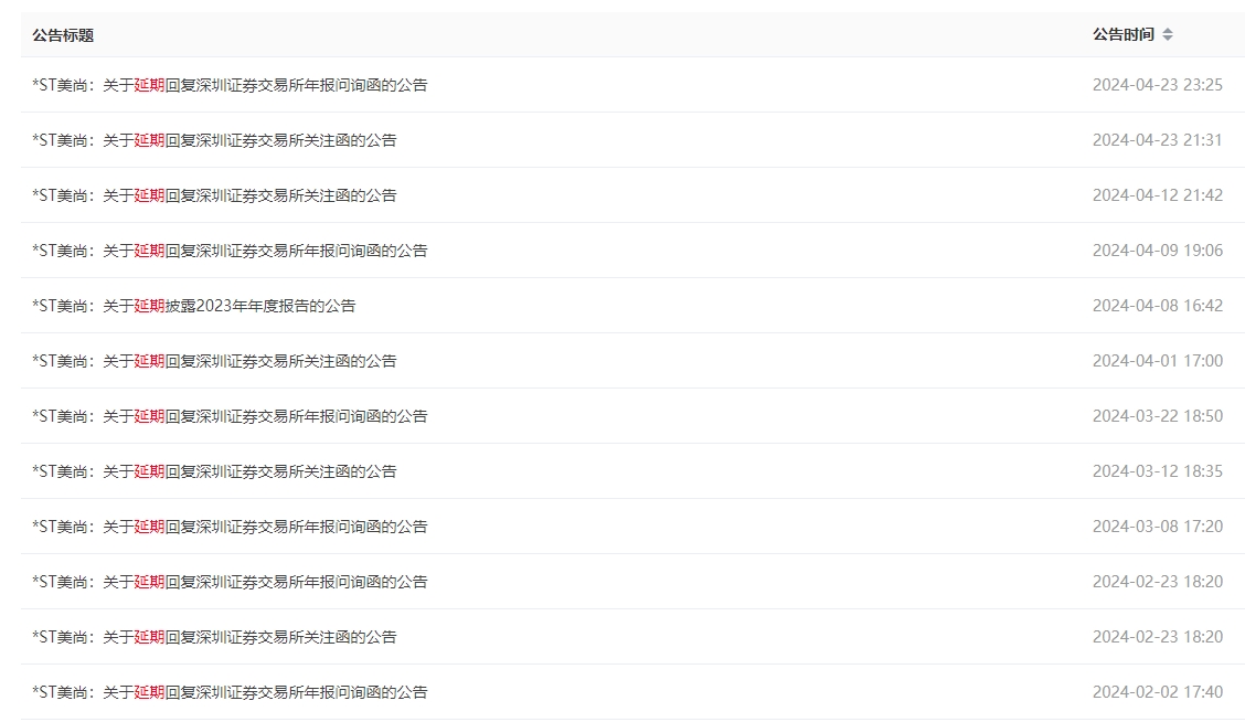 公告截图公告显示,公司2023年5月15日即已收到深交所《关于对美尚生态景观股份有限公司的年报问询函》(创业板年报问询函【2023】第166号),要求公司在2023年5月29日前将有关说明材料报送创业板公司管理部并对外披露,同时抄送深圳证监局上市公司监管处