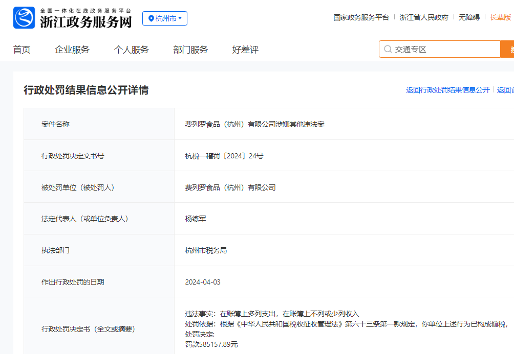 49中国网财经4月25日讯 日前,费列罗食品(杭州)有限公司因在账簿上多列支出、在账簿上不列或少列收入,构成偷税,被杭州市税务局罚款58万余元,处罚日期为2024年4月3日