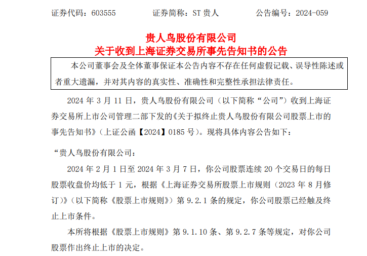 不得“一退了之”值得注意的是,另据贵人鸟公告,3月11日收到上交所监管工作函,截至公告日,ST贵人尚存在控股股东及董事增持计划未完成、实控人控制企业未向公司返还大额款项等事项