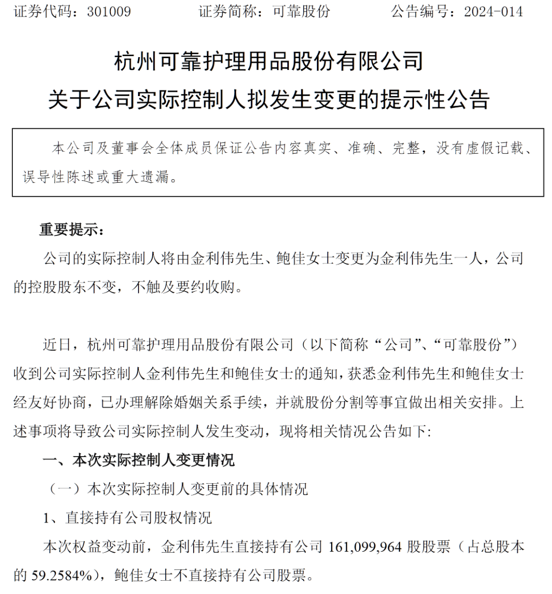 2月28日,可靠股份公告,近日,公司收到实际控制人金利伟和鲍佳的通知,获悉金利伟和鲍佳经友好协商,已办理解除婚姻关系手续,并就股份分割等事宜做出相关安排