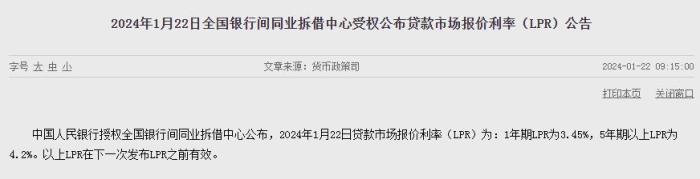 1月LPR报价出炉:1年期LPR为3.45%,5年期以上LPR为4.2%