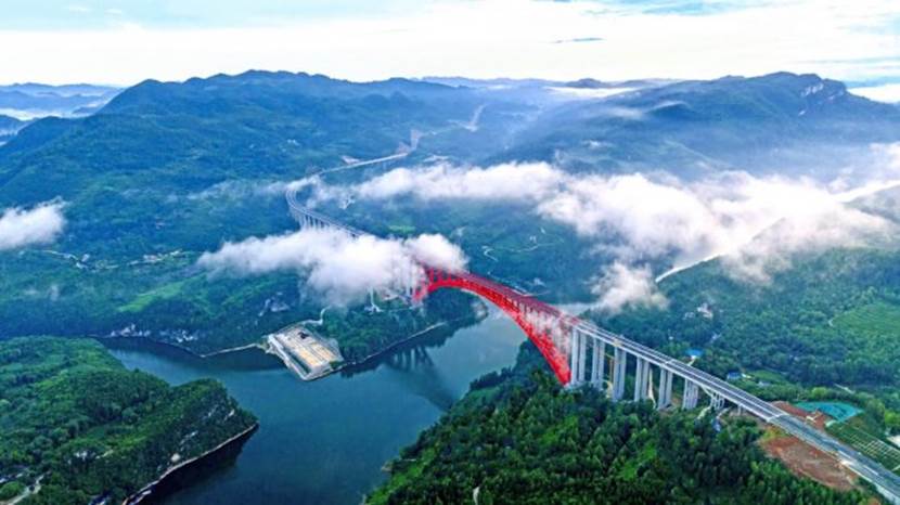 2022年,面对德余高速乌江特大桥504米超大跨径的世界级挑战,世通重工集成创新了“以折代曲”定制制造、“立拼+卧拼”双拼工艺,国内首创“拱肋原形复位安装”、“大跨度钢管拱首节段反向精调”等核心技术,确保精准建造、一次成优。