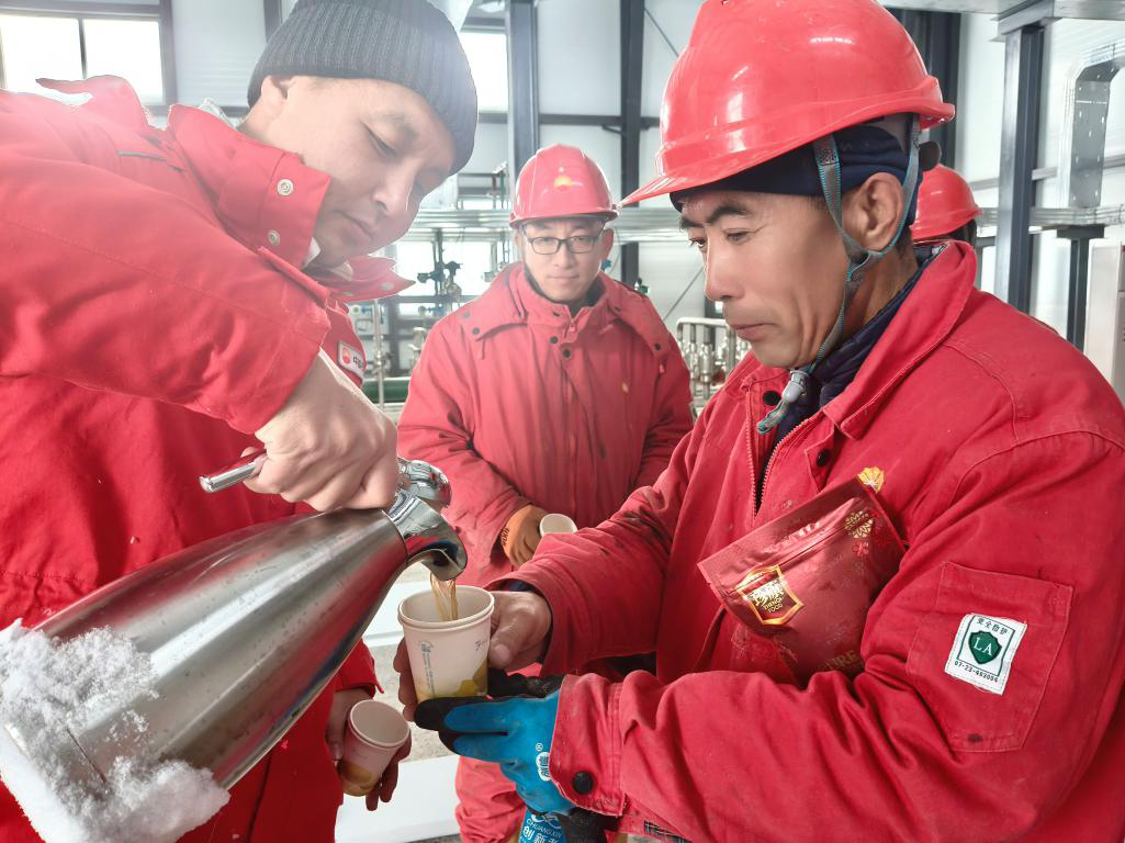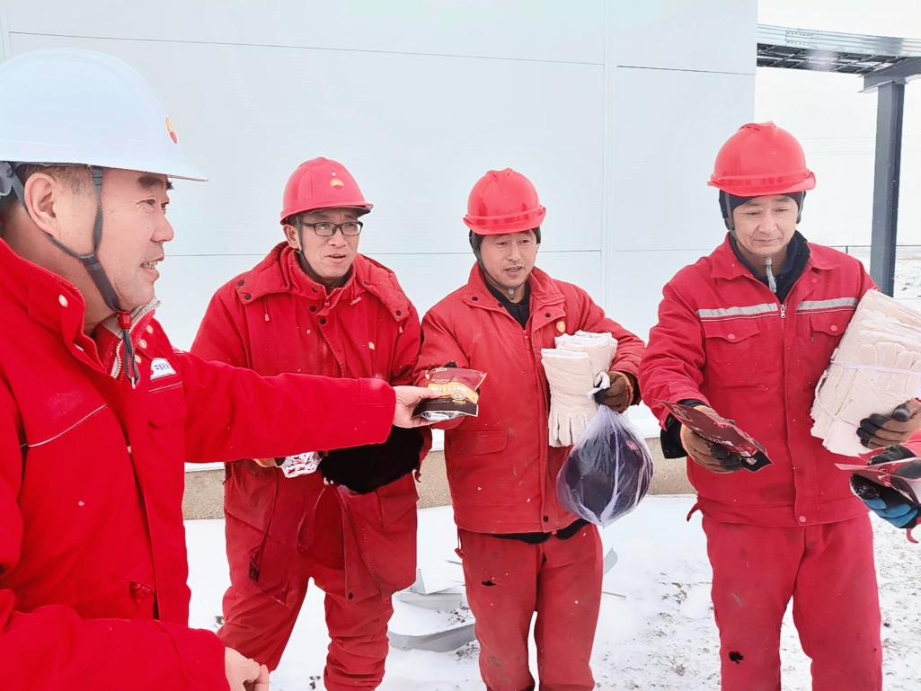 面对突如其来的降雪,监督管理中心副主任李宝良除了惦念前线的生产任务,更加放心不下的是施工人员的温暖与健康。26日一早,李主任便载着姜汁红糖、狗皮帽子和棉手套驱车10公里赶往注入站慰问前线施工人员,细致了解了冬季施工人员需要落实的保障与保暖防护情况,并亲切的送上了红糖水。李主任说“设备保温是为了生产,人心保温也是为了生产,不能为了夺时助产,而凉了党员群众们的心。两手都要抓,两手都要硬才是稳定冬季生产的关键。”