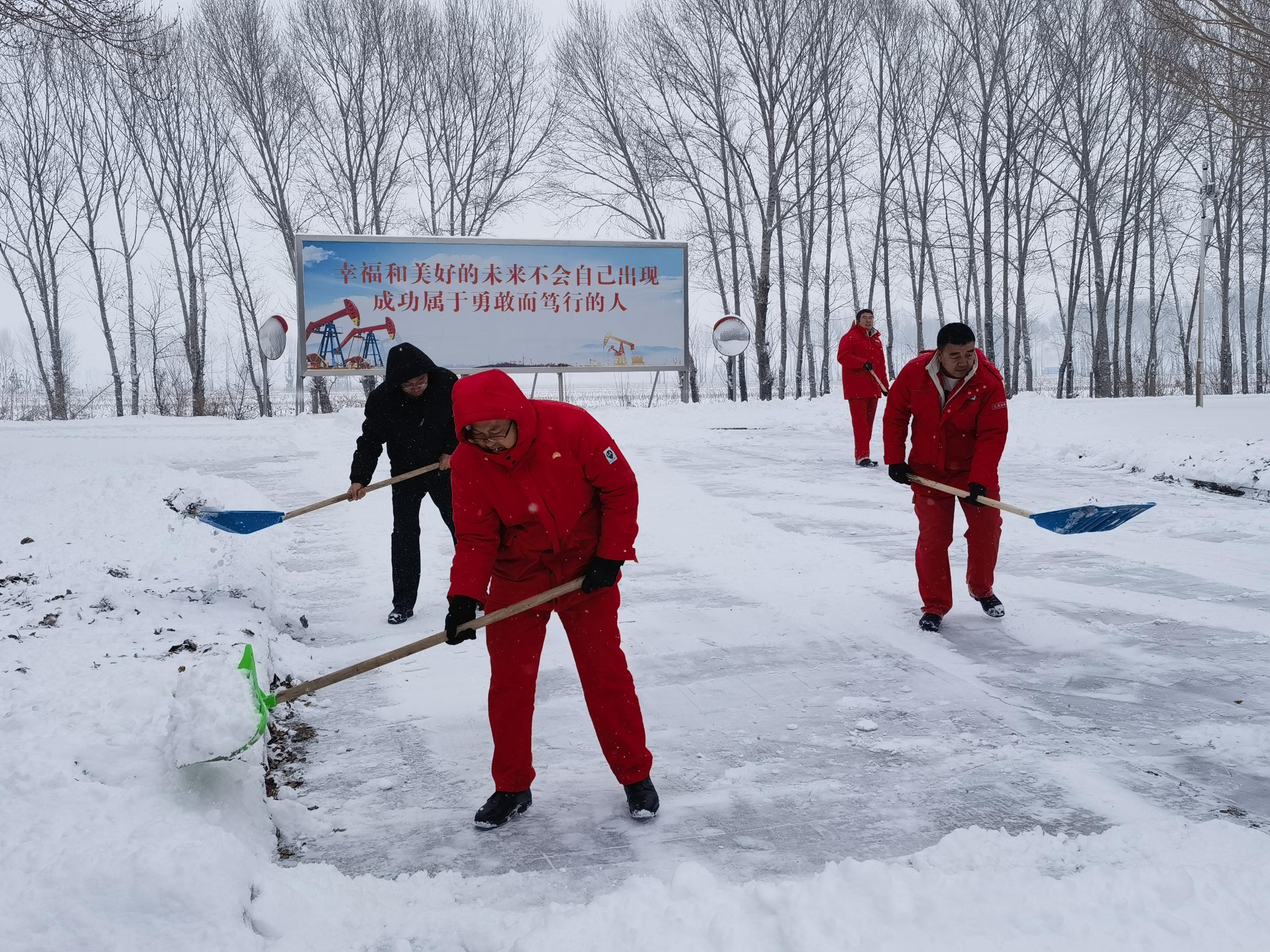 同时,进一步做好安全保障工作,基层党员干部加密巡井巡线频次,加强对重点区域、重点井、重点设备的检查,消除各类隐患,保障各类设施设备正常运转;党员发挥先锋模范作用,冲锋在前,对油区道路撒盐融冰,不畏严寒,扛起雪铲、扫帚,对砂石路、土路积雪进行清理,保障道路畅通。