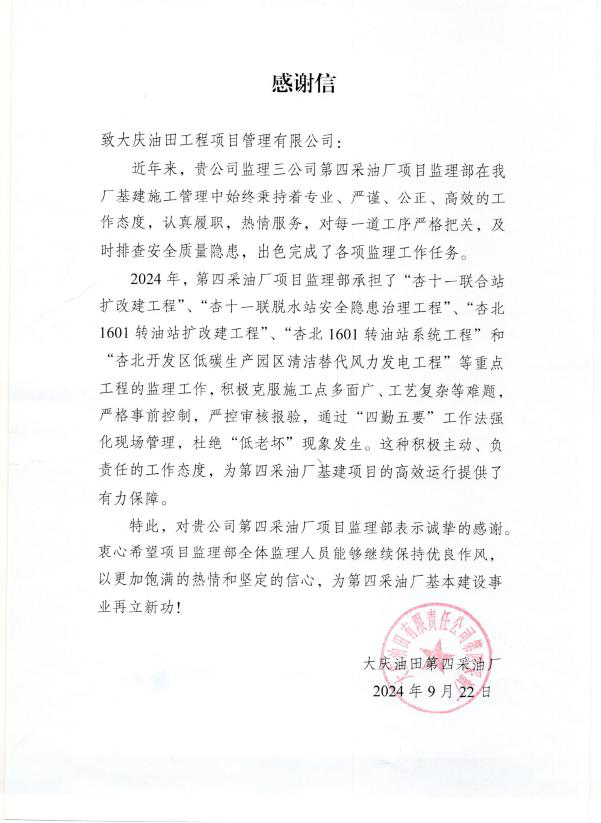 大庆油田工程项目管理公司监理三分公司第四项目监理部,多年来一直为第四采油厂产能建设提供监理服务,这支队伍专业水平过硬,责任心强,还特别能吃苦,无论是产能建设还道路工程、无论是民心工程还是新能源开发建设工程,他们都能凭借专业能力和严细认真的工作态度高标准、高质量、高效率地完成监理工作任务,他们总结出的“四勤五要”工作法在监理工作中发挥重要作用,得到了业主的高度赞扬,今年十一前夕,第四采油厂专门给第四项目部送来锦旗和表扬信,肯定了“四勤五要”工作法的作用。