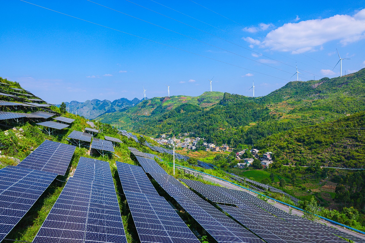 俯瞰黔贵大地,不计其数的光伏板沿着山势铺满了千沟万壑,在阳光下汇成“蓝色海洋”;一座座大型风力发电机矗立山巅,巨大的叶片随风而舞,向电网源源不断输送绿电;储能电站里的电池舱整齐排列,正在进行有序的电能“下载”与“上传”工作,提高电力系统稳定性。