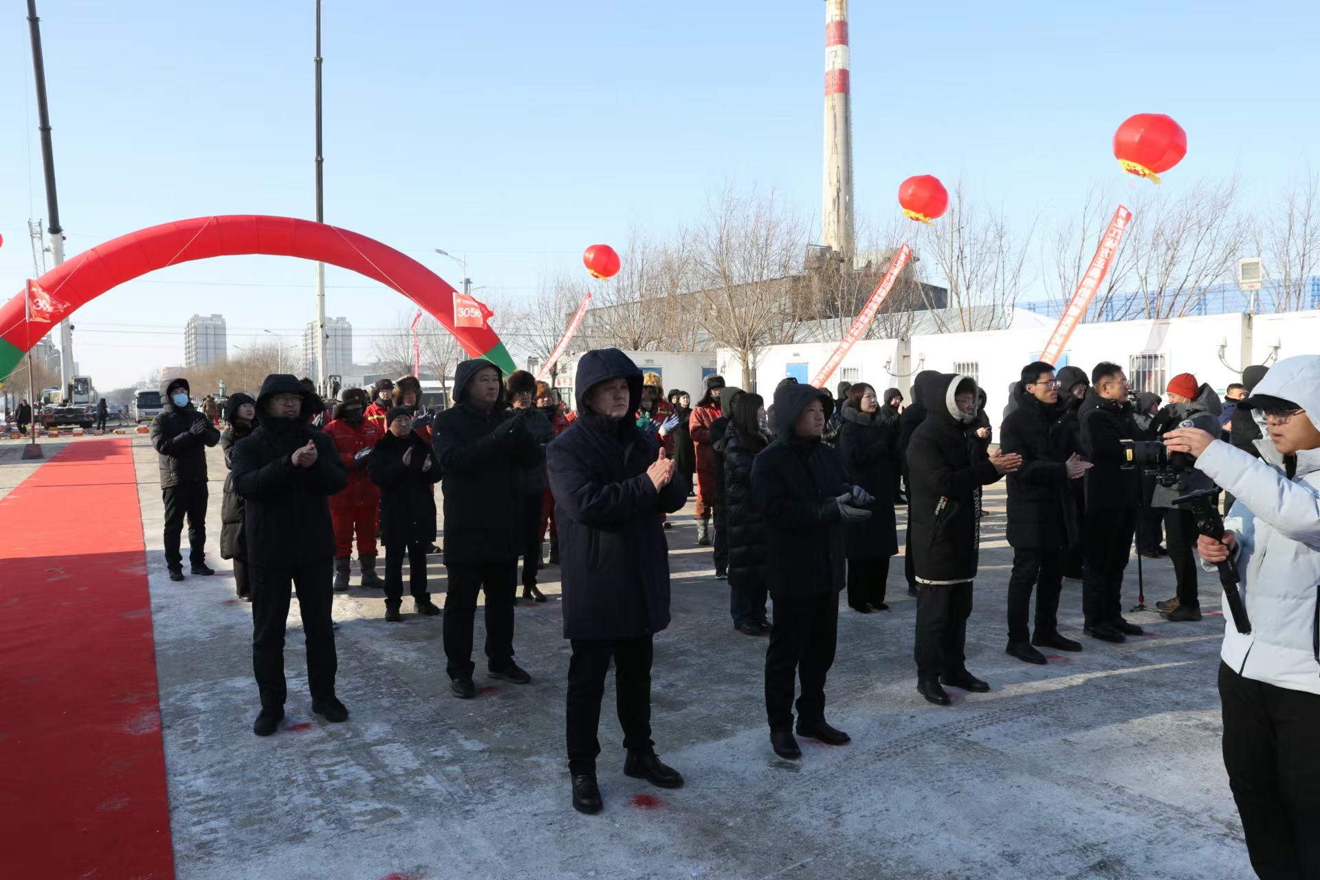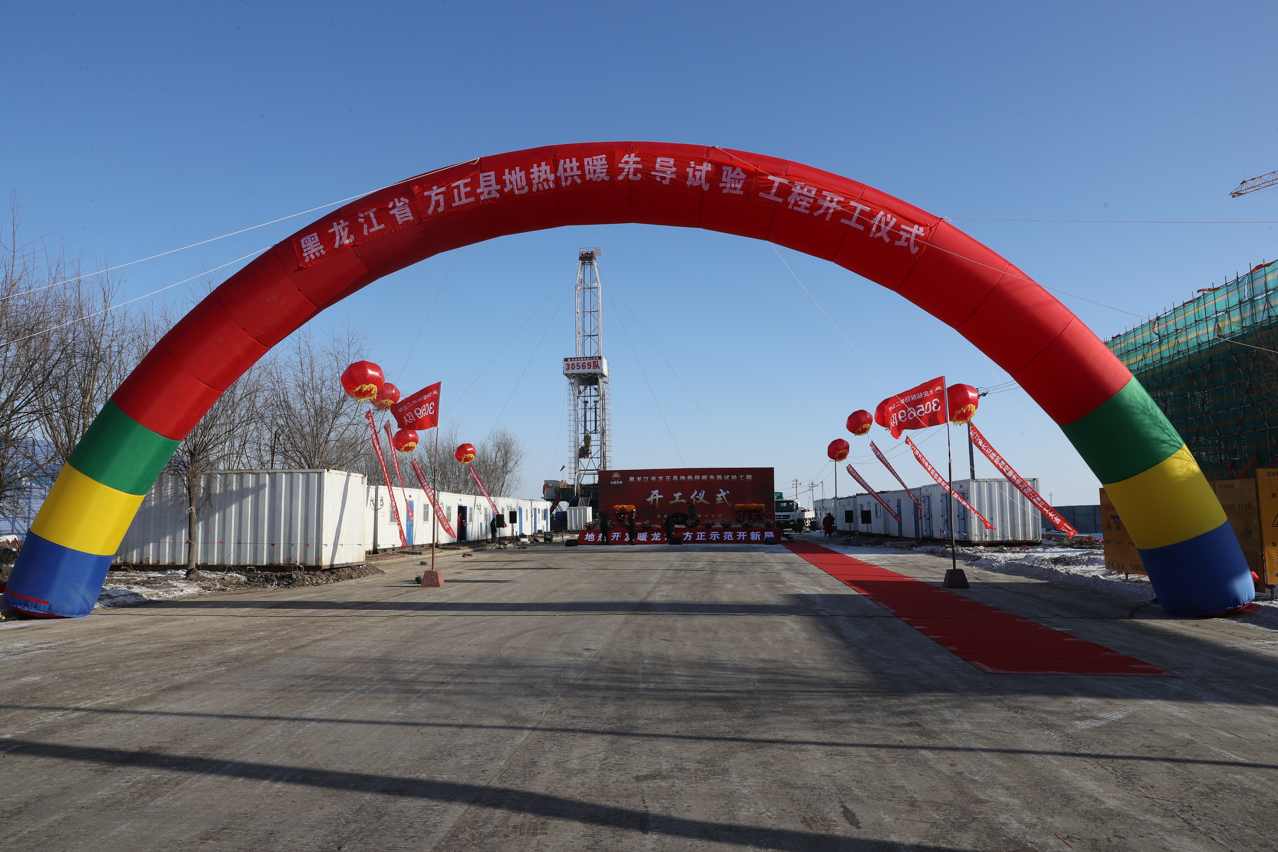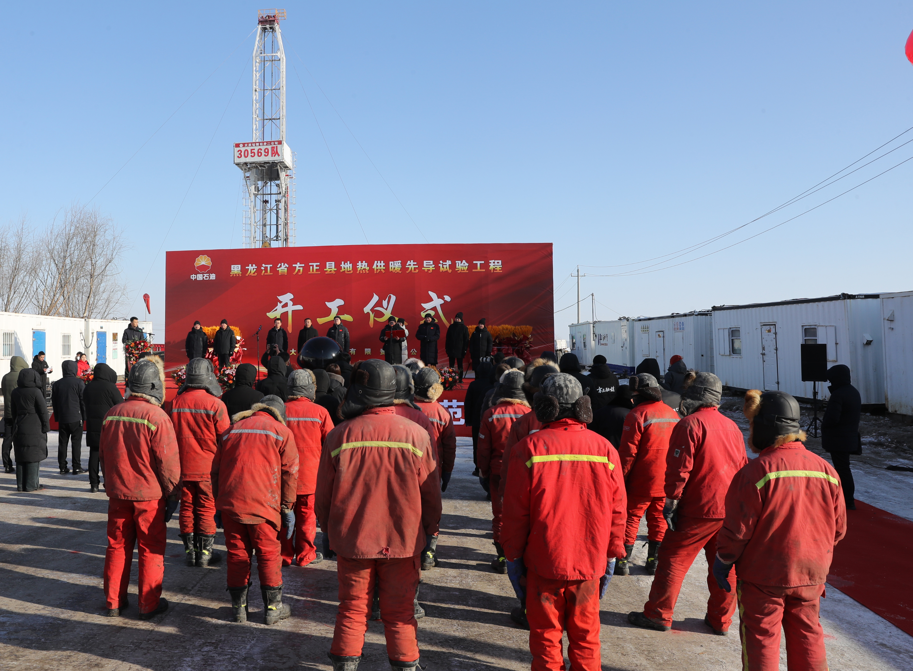 2024年12月12日上午10时42分,在黑龙江省方正县地热供暖先导试验工程钻井施工现场,方正县地热供暖先导试验工程开工仪式正在举行。由大庆钻探钻井二公司副经理常城、总工张健带领的公司生产指挥中心下属30569钻井队正在接受方正县、大庆油田、大庆钻探、宏宇热力主要领导的检阅。