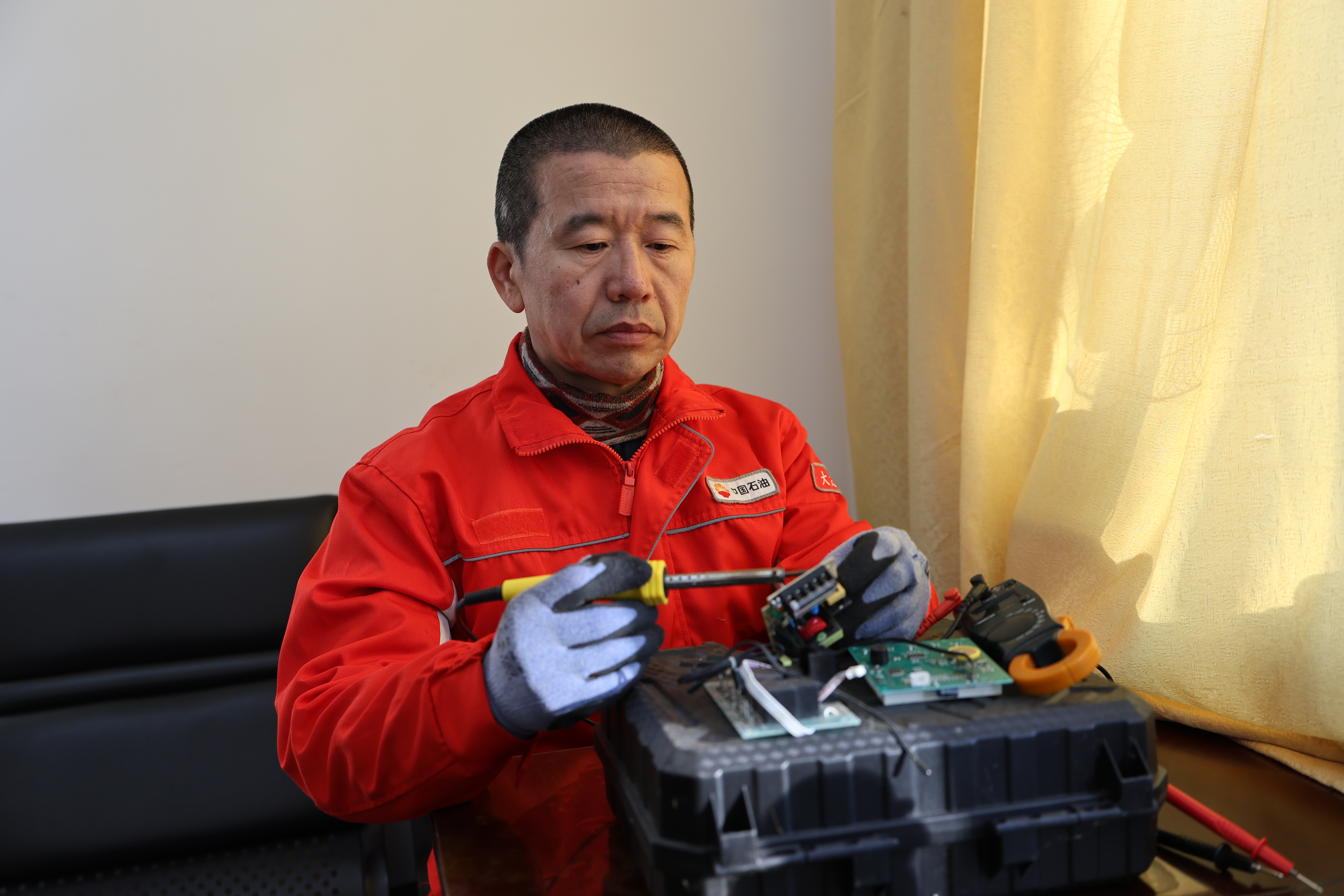 李代纪师傅就这么出了名,大家都知道李代纪会维修,厨房电饼铛坏了,就喊老师傅来,稍微一捣鼓就好用了;楼里的灯坏了,不用全换,换一个小小的电容器就又亮了;野营房里的电暖气坏了,电烙铁在控制电路板上走一圈,就又能取暖了。就这样,老师傅把自己的爱好发挥到岗位上来,一干就是三四年,如今还有3个月就要退休的李代纪,每天还默默无闻地拎着工具包在公司服务,累计至今,已修理大大小小各类仪器设备100余项,为公司节省了可观的经济效益。(王锰)