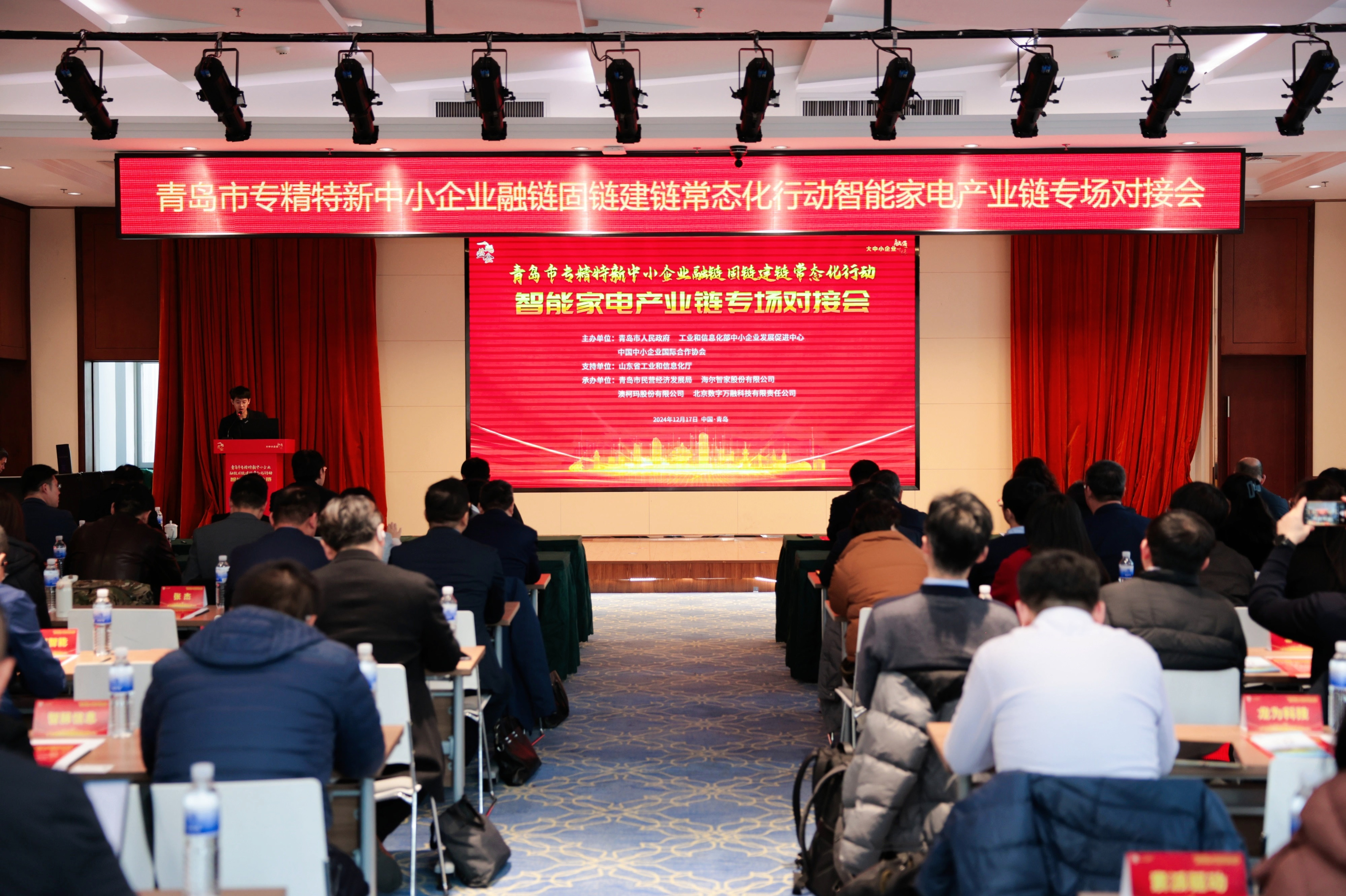 12月17日下午,青岛市专精特新中小企业融链固链建链常态化行动围绕智能家电产业链举办专场对接会,共同探讨智能家电产业发展现状及未来趋势,加强产业链上下游协同联动,助力链上企业融通创新发展。活动由青岛市人民政府、工业和信息化部中小企业发展促进中心、中国中小企业国际合作协会主办,青岛市民营经济发展局、海尔智家股份有限公司、澳柯玛股份有限公司、北京数字万融科技有限责任公司承办,共有来自政府部门、国家平台机构、科研院所、行业专家、链主企业、全国及青岛市优质中小企业代表近100余人参加活动。