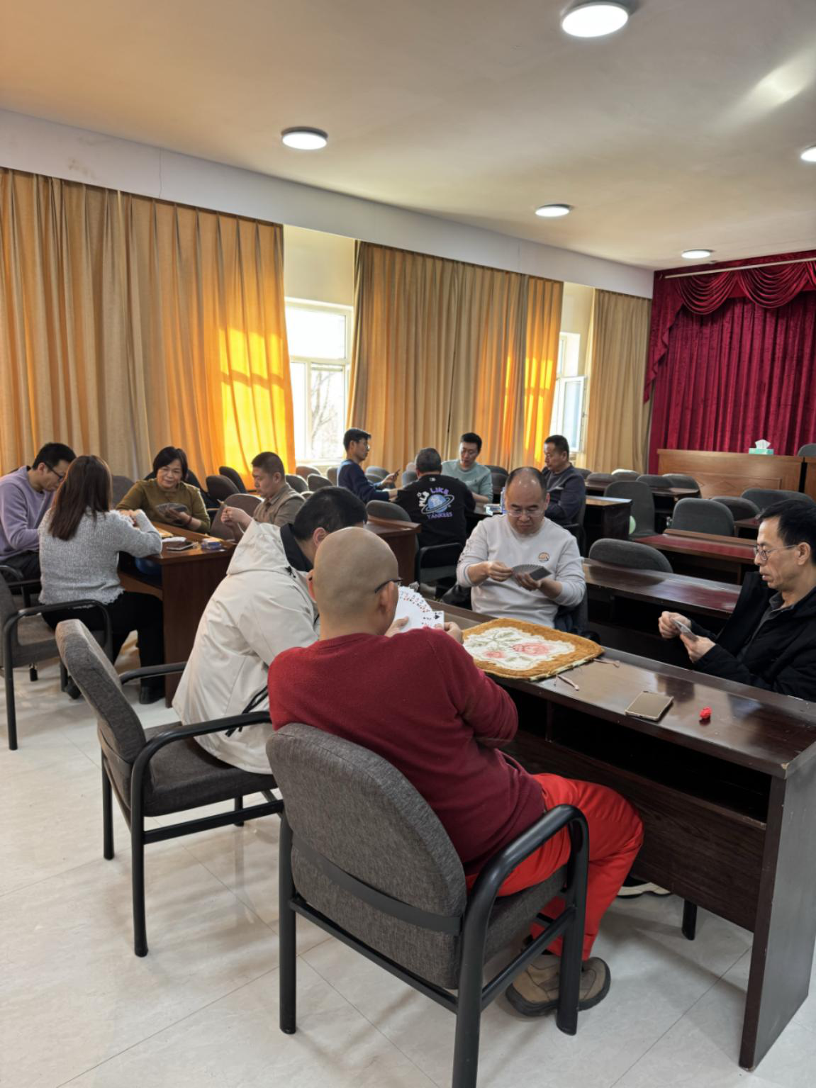 最后是扑克比赛,每组队员在牌局中密切配合,斗智斗勇,经过近两小时,最终评出获胜选手,大家在轻松愉快的氛围中交流牌技,增进感情,展现出良好的竞技状态和团队协作精神。