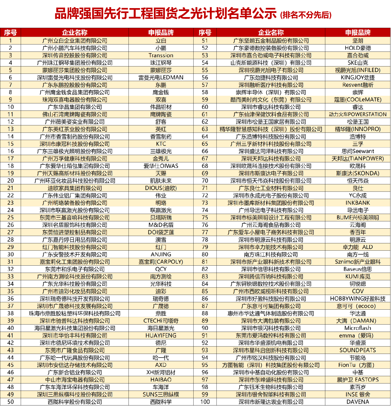 立白、小鹏、传音Transsion、珠江钢琴、蒙娜丽莎、雷曼光电LEDMAN、东鹏、鹰金钱、双喜、伟昌铝材、鹰牌陶瓷、舒客、英红、香雪制药、KTC、三雄极光、金秀儿、爱华仕OIWAS、天赐、肌肤未来、DIOUS迪欧、伟业、明珞、联赢激光、贝塔斯瑞、M&D名盾、DOI袋芝蓮、澳雪、红门、ANJING、嘉宝莉CARPOLY、QCY、南方测绘、光华科技、迪彩、瑞奇德、广晟德、鼎胜、CTECHi司塔奇、海目星激光、HUAYIFENG、德尼、广隆、哈一代、AXD、XH新河铝材、HAIBAO、车海洋、SUNS三思纵横、西陇科学、坚朗、HOLD豪德、嘉合劲威、SKE山克、视爵光旭INFILED、KINGJOY劲捷、Resvent融昕、崇辉、蔻墨COOLeMATE、睿达、动力火车POWERSTATION、松堡王国、精华隆INNOPRO、浩博特、三孚新科、思问Seewant、天邦达TIANPOWER、欧晟科、斯康达SKONDA、恒天伟焱、良仕、YC永成、INKBANK、导远电子、BUME兴标美照明、云海阁、香百年、明源云、卓力能ALD、南方一线、Sznimo新产业眼科、Baseus倍思、KUMI库觅、钶锐锶、COV、HOBBYWING好盈科技、意可可ecoco、华达通、大满DAMAN、Microflash、emma爱玛、华盛源、SOUNDPEATS、节能岛、FionTu方图、中基、展护卫EASTOPS、素百岁、INSE银舍、DAVENA、崀玉、WAICHI中伟志、北鼎Buydeem、春之唤、新豪轩、白云泵业、磊蒙机械、WODTOP、3onedata、日信高科、酷骑、素肌良品、Carku卡儿酷、原感、SAKO三科、耐尔金Nillkin、力越新材、PP停车、锦凌、金鸿星、AWEI用维、FLYCDI、威科伟业、春凯、希立仪器、镭硕光电、优米UMIDIGI、ACF软谷、huoban、西比特CPT、HI-SEMICON深鸿盛、Enbon、莱姆森Lamxon、瀚宏音响、汇美淀粉科技、山泽SAMZHE、鹏塑PS、丰睿成、TORRAS图拉斯、天溯、NUOMI诺米、中顺、海悟HAIWU、EYANG、箭ARROW、第一福、麟云、FAROAD路远、PARKOO百奥、T-Brisun泰明辉、飞德利、纳泽、捷工(Genewell)、华大北斗ALLYSTAR、德森DESEN、JUHOR玖合、金凯地、ZKTeco熵基、江机、健信JX、新元素、台工智造LISU-LED、问止中医、美兆、AI机器时代、穗风、好视力、HORB、晟颐隆SY、科工充美、CJTCONN、Wotech华天成、两岸半导体、雄毅华、XHGEAR、洁盟skymen、南联、日联科技、EPROPULSION、华笙光、WABON、凯尔城、PECRON百克龙、JB、热立方、仕兴鸿数控、快盾、湘联、中为、华桑、同益新、GsWear、宇航光通、赛贝尔、心德实业、益联塑胶、瑞牌RUIPAI、五羊城、豪隆盛木业、晟禾家具。