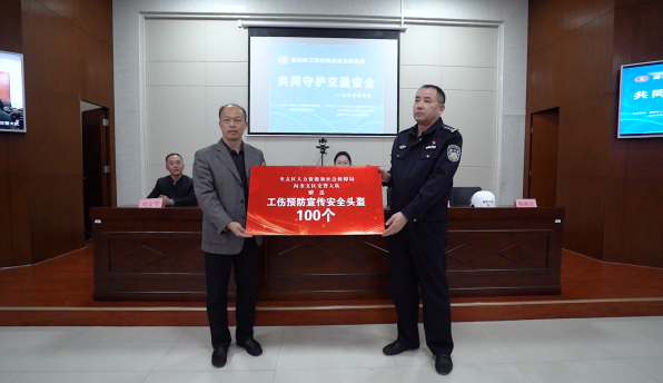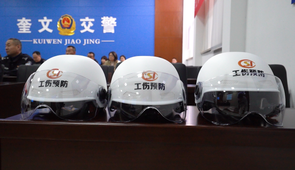 奎文区人社局向奎文区交警大队赠送印有工伤预防宣传的安全头盔(100个)。