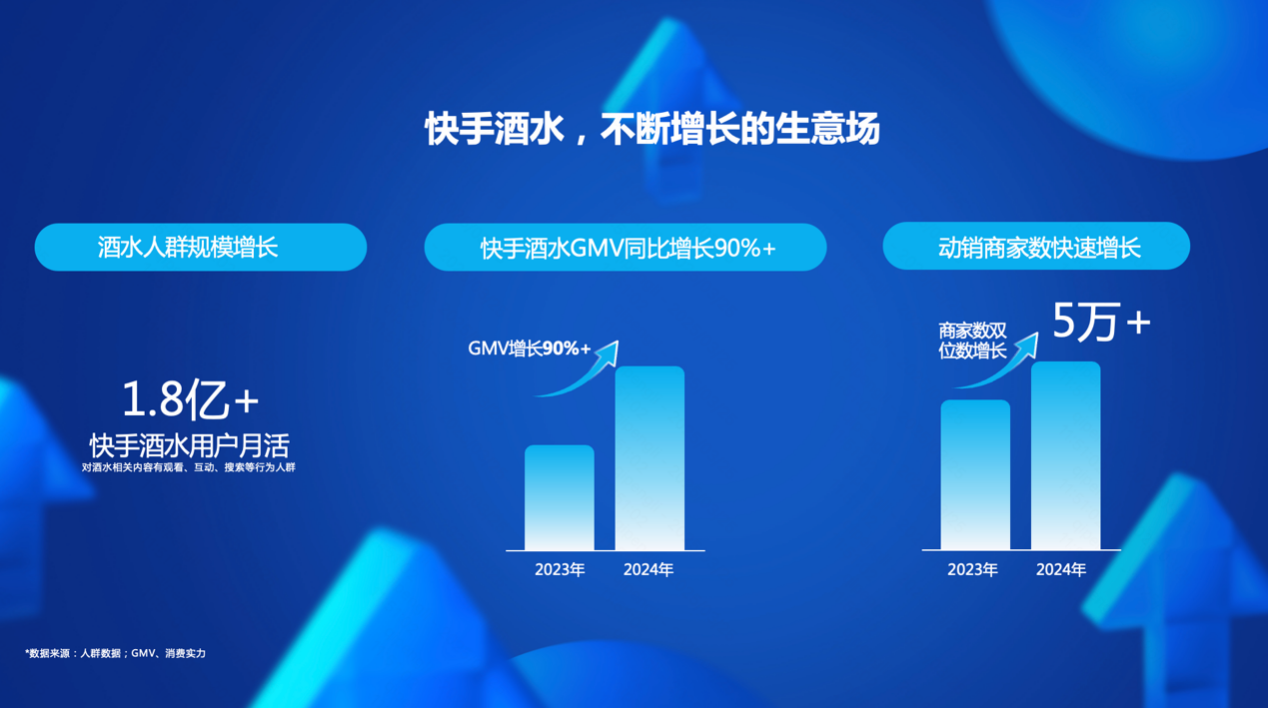 平台数据显示,当前快手酒水用户月活超1.8亿(对酒水相关内容有观看、互动、搜索等行为人群),快手酒水2024年GMV同比增长超90%,动销商家数超5万。2024年,快手酒水新增10个破亿GMV品牌,近500个酒水自播商家GMV增长超100%。