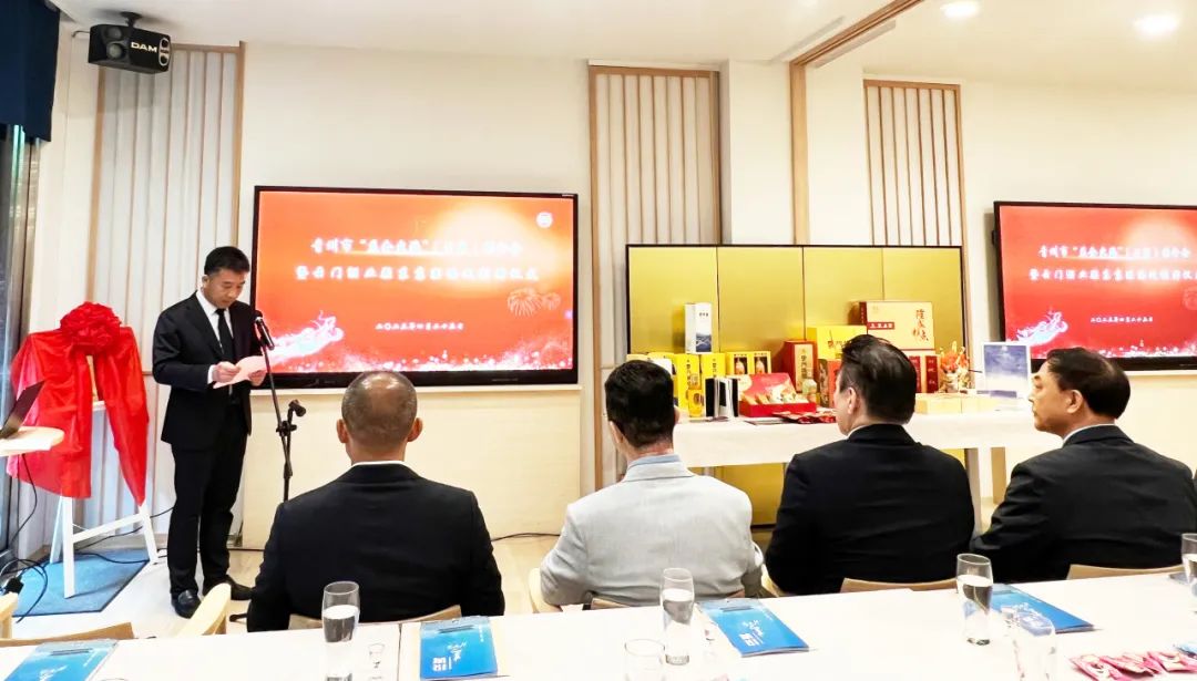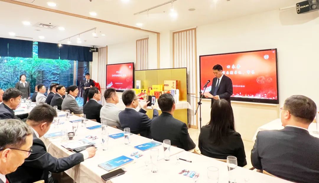 云门酒业股份公司副总经理唐树林主持此次青州市“益企出海”(日本)推介会暨云门酒业驻东京联络处揭牌仪式。