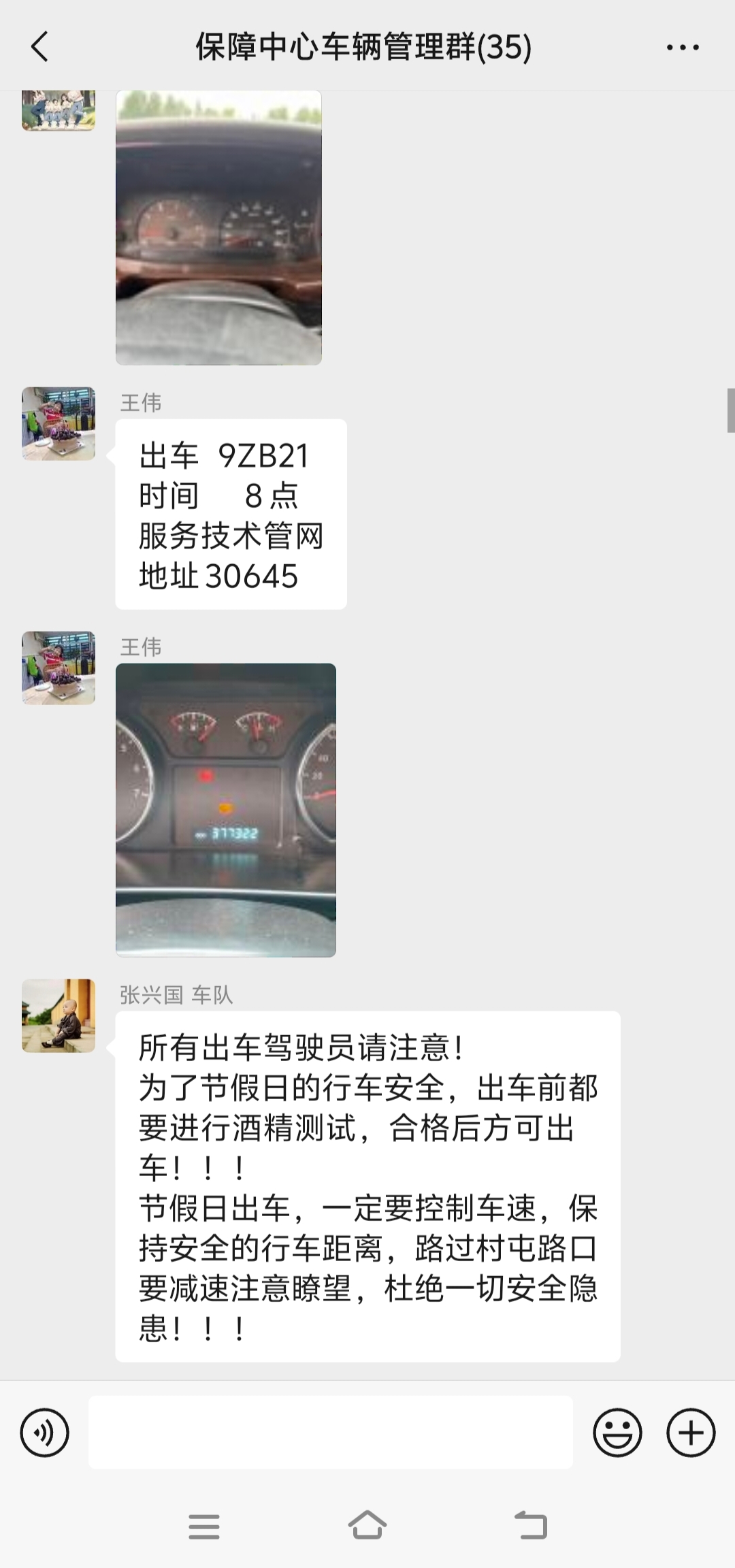 清晨7点,生产服务队值班干部张兴国已经在车辆管理群发出警示:“所有出车驾驶员,必须通过酒精检测方可出发!”